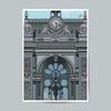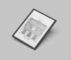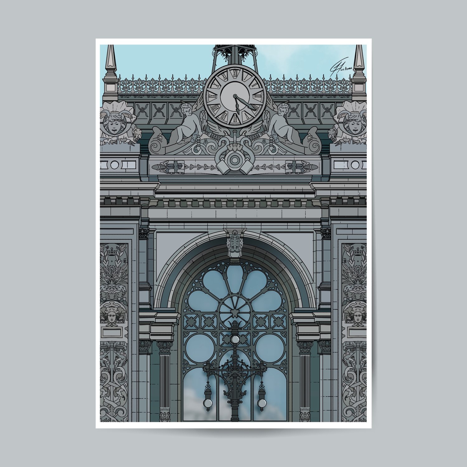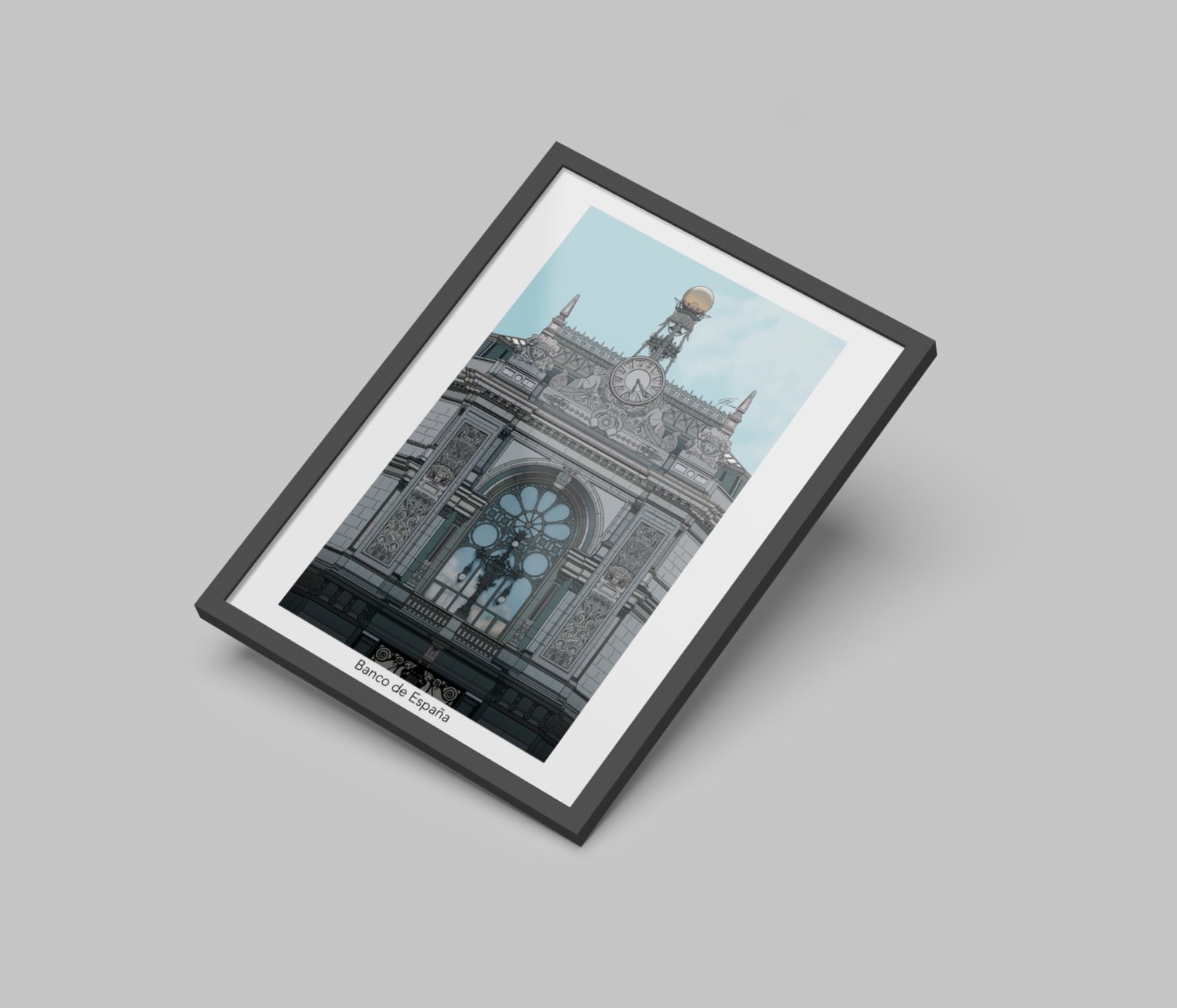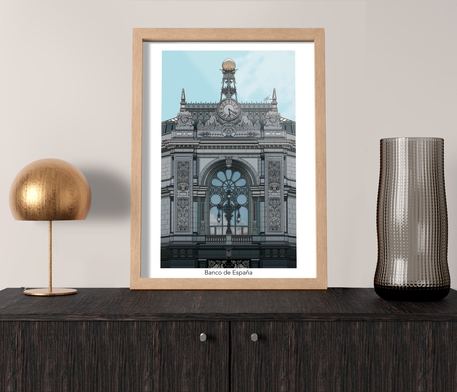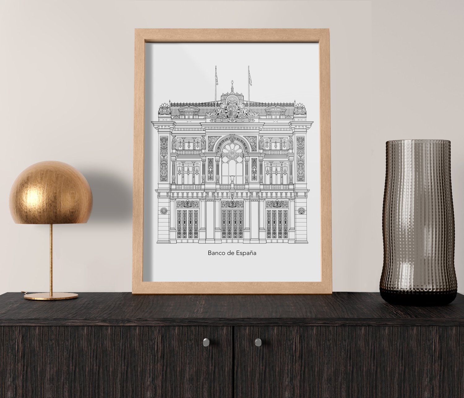 Ilustración de trazos limpios que destaca la imponente fachada neoclásica del Banco de España. Líneas precisas capturan columnas y ventanales, enfatizando la simetría y elegancia del edificio en una vista frontal.