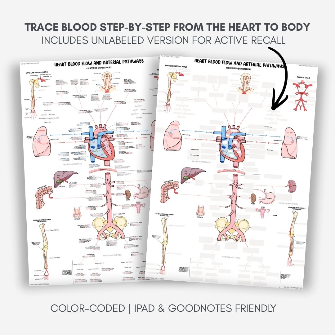 This mind map helps connect heart blood flow with the arterial pathways, so you can trace blood step-by-step!