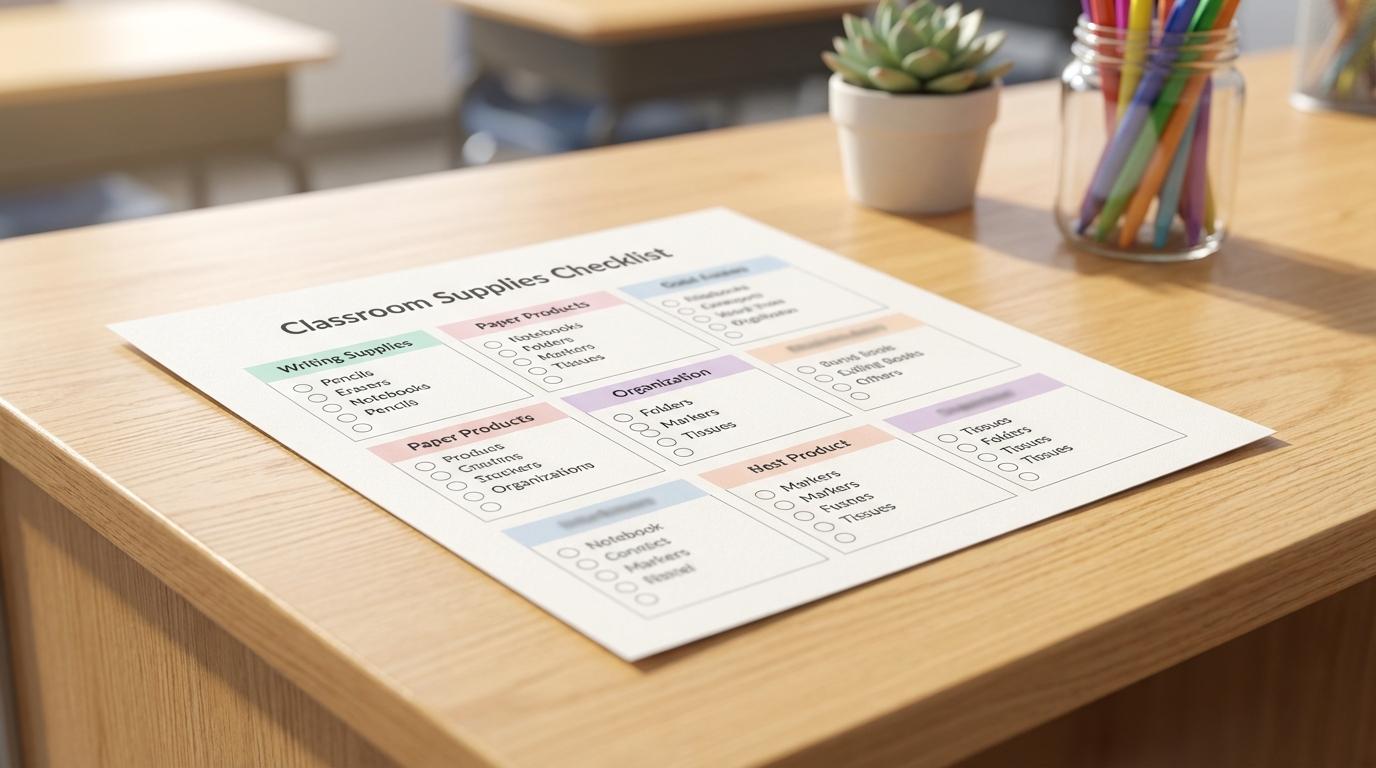 Featuring a sophisticated 3x3 grid, the layout is divided into nine essential categories including Writing Supplies, Paper Products, Organization, and Technology. Each section is accented with soft pastel-colored headers and features circular checkboxes for a satisfying inventory tracking experience.