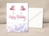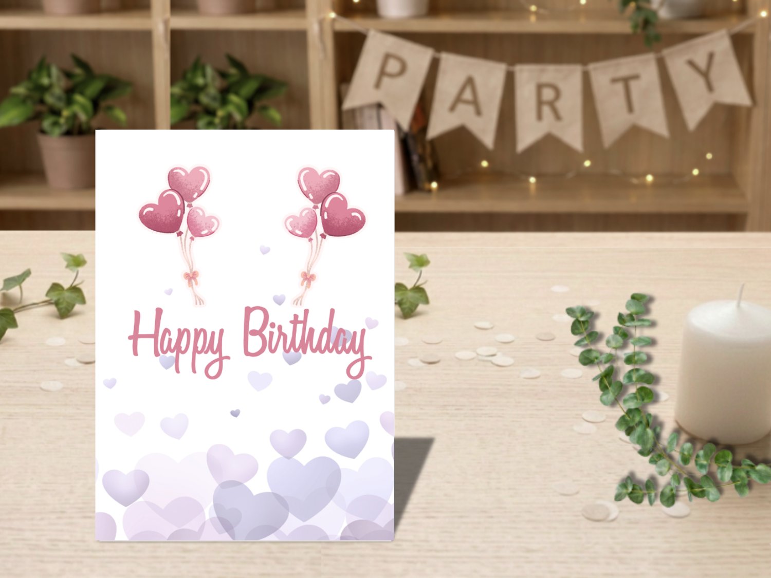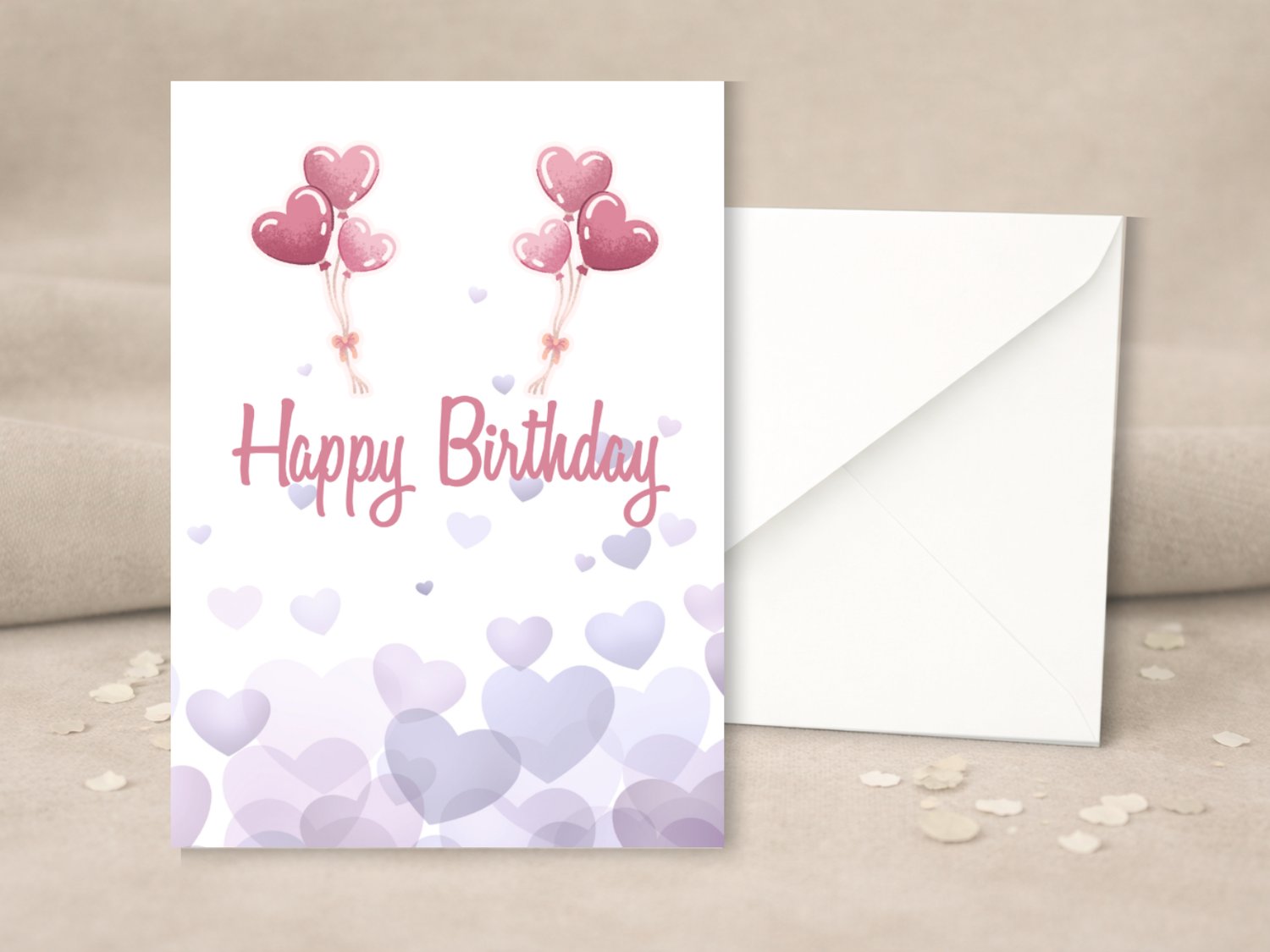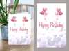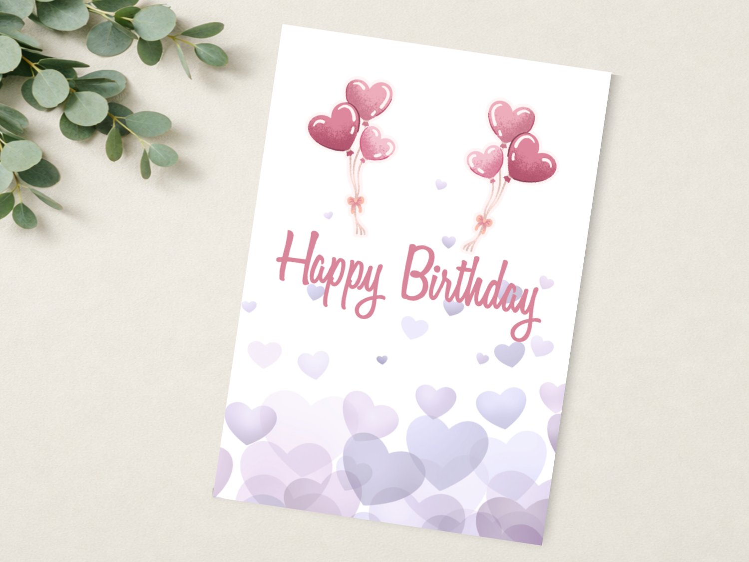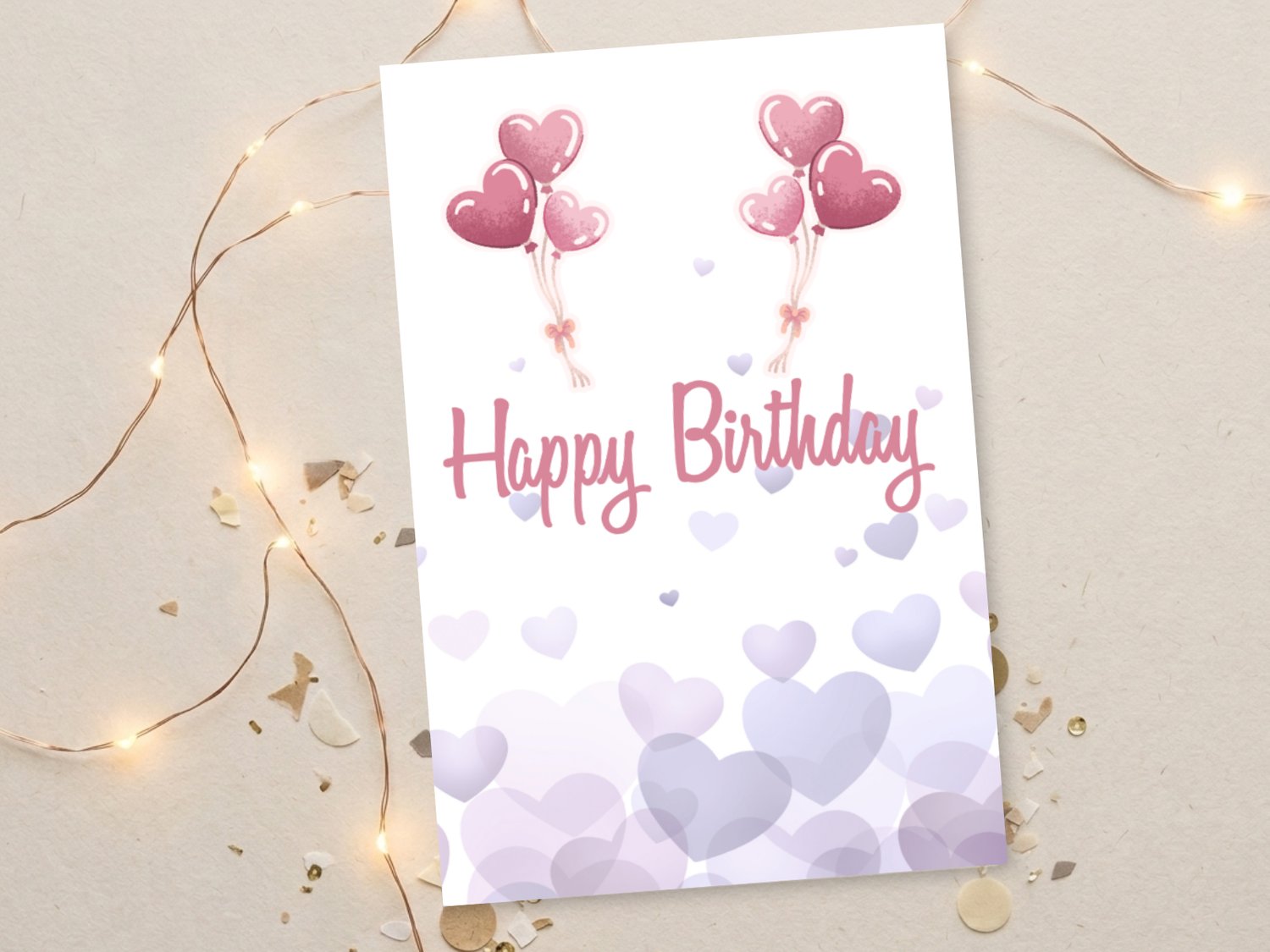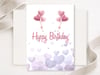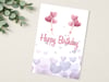 Celebrate with a touch of sweetness! This printable birthday card features a light lavender background with scattered pastel hearts and two sets of pink heart-shaped balloons floating above the “Happy Birthday” message.