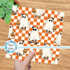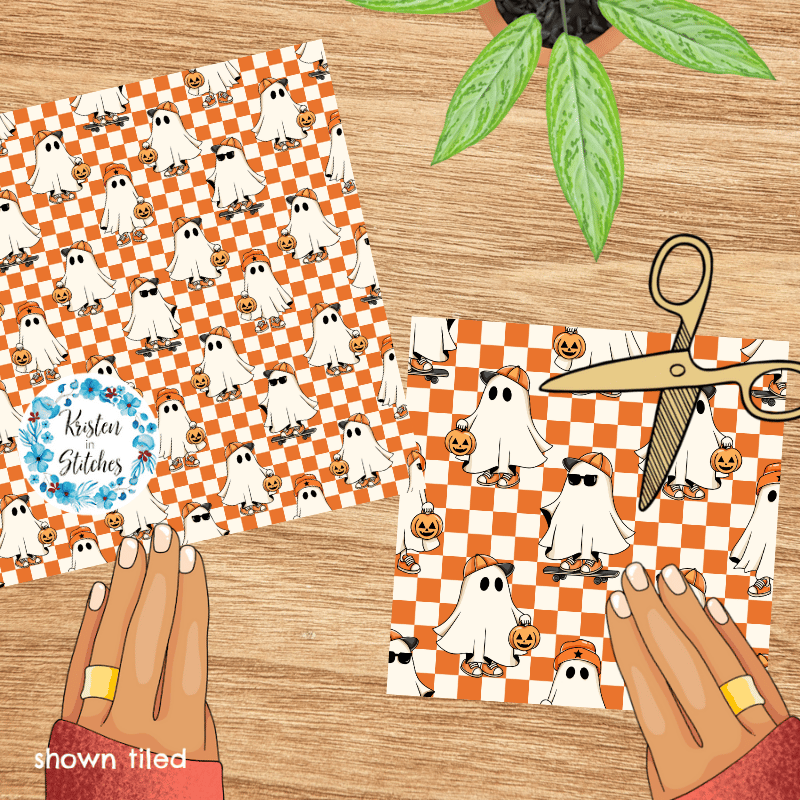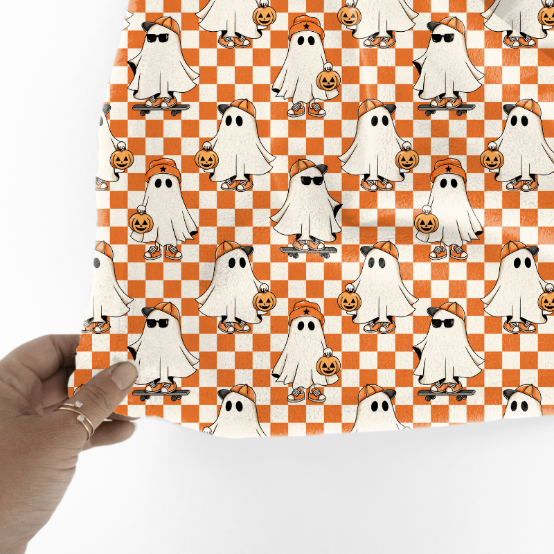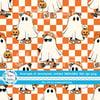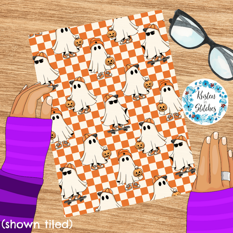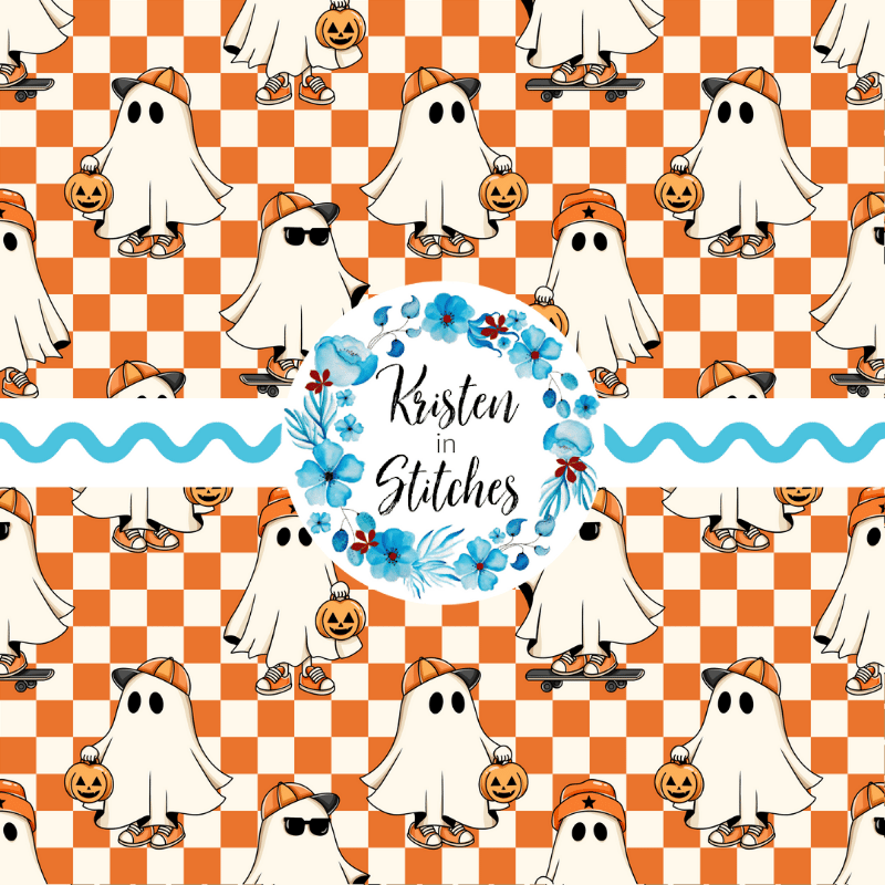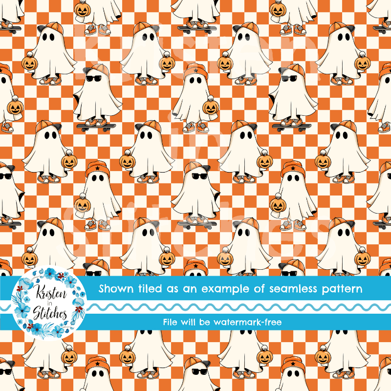 Cool kids skateboarding ghosts with baseball caps, sunglasses, sneakers and pumpkins on orange checkerboard.