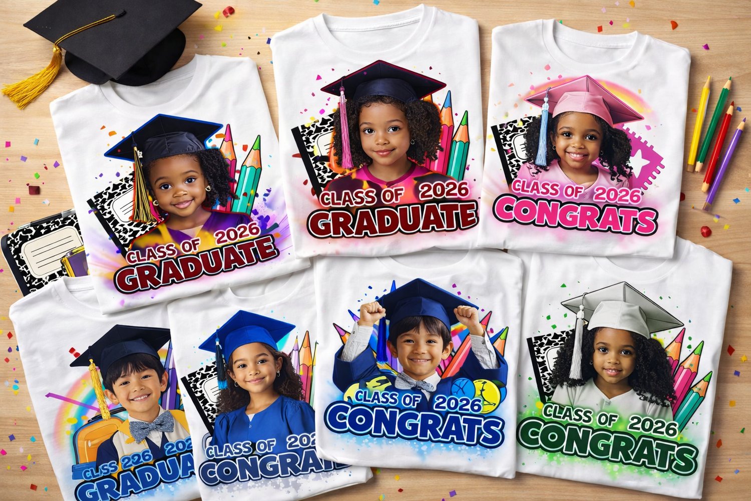 These designs are great for graduation shirts, party apparel, keepsakes, and school celebration outfits.