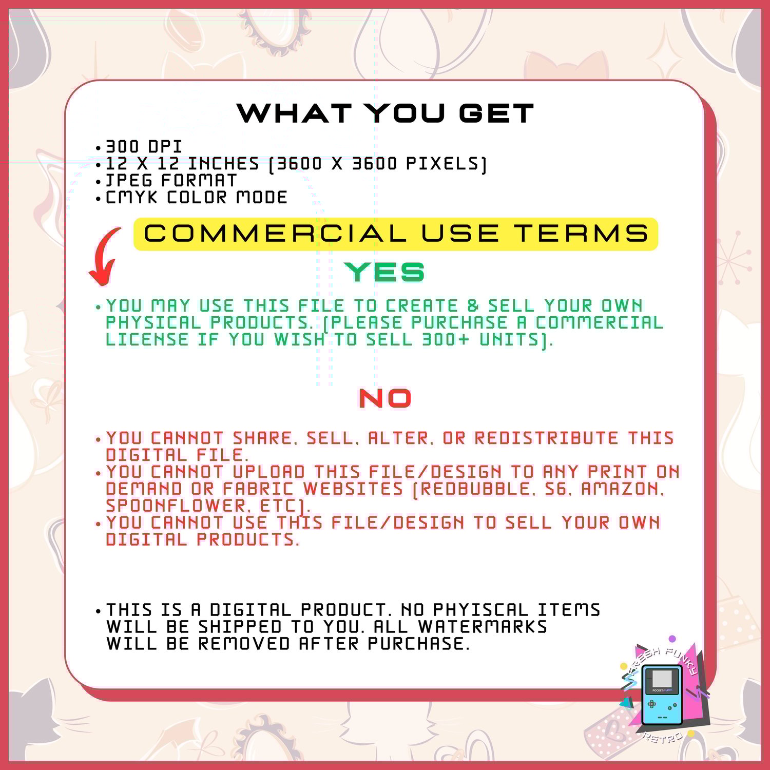 - You cannot upload this file/design to any print on demand or fabric websites (Redbubble, S6, Amazon, Spoonflower, etc).