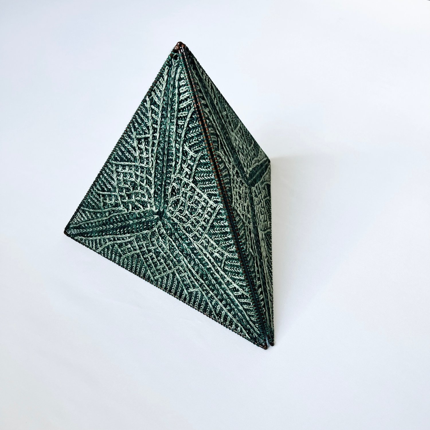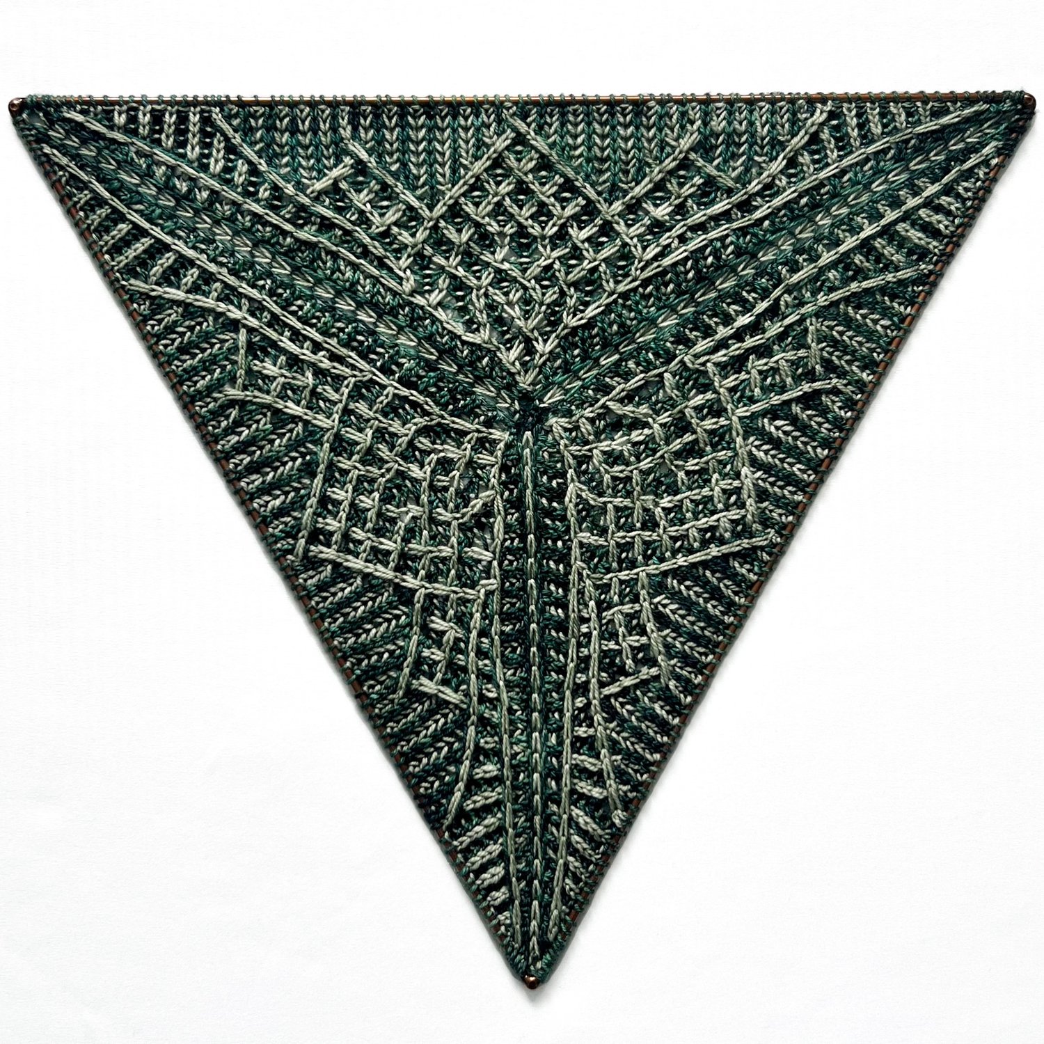 The Ice Mountain Triangle pattern is worked in-the-round from the center out and creates a single equilateral triangle with an original brioche cabled stitch motif. While this pattern does require attention it is also a fun smaller project that introduces a number of techniques.