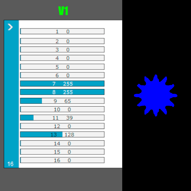 * Verifique que coincidan estos canales: 8 Dimmer, 7 Strobo / Shutter, 9 en el valor 65 = Color Azul, 11 en el valor 39 (V1) / 82 (V2) = Gobo de Sol, 13 foco (ver fotos 3 y 4).