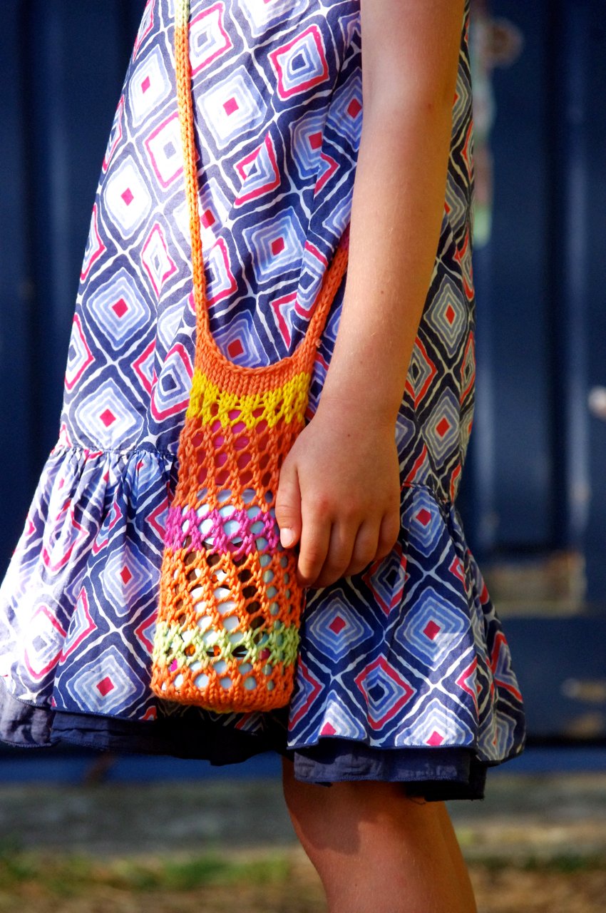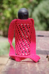 Bishi begins in the middle of the base with a circular cast-on. After increasing to work the base, the body of the bottle holder is knit in round using a simple mesh pattern. Two options for straps are provided, with both finished off by simply tying them together.