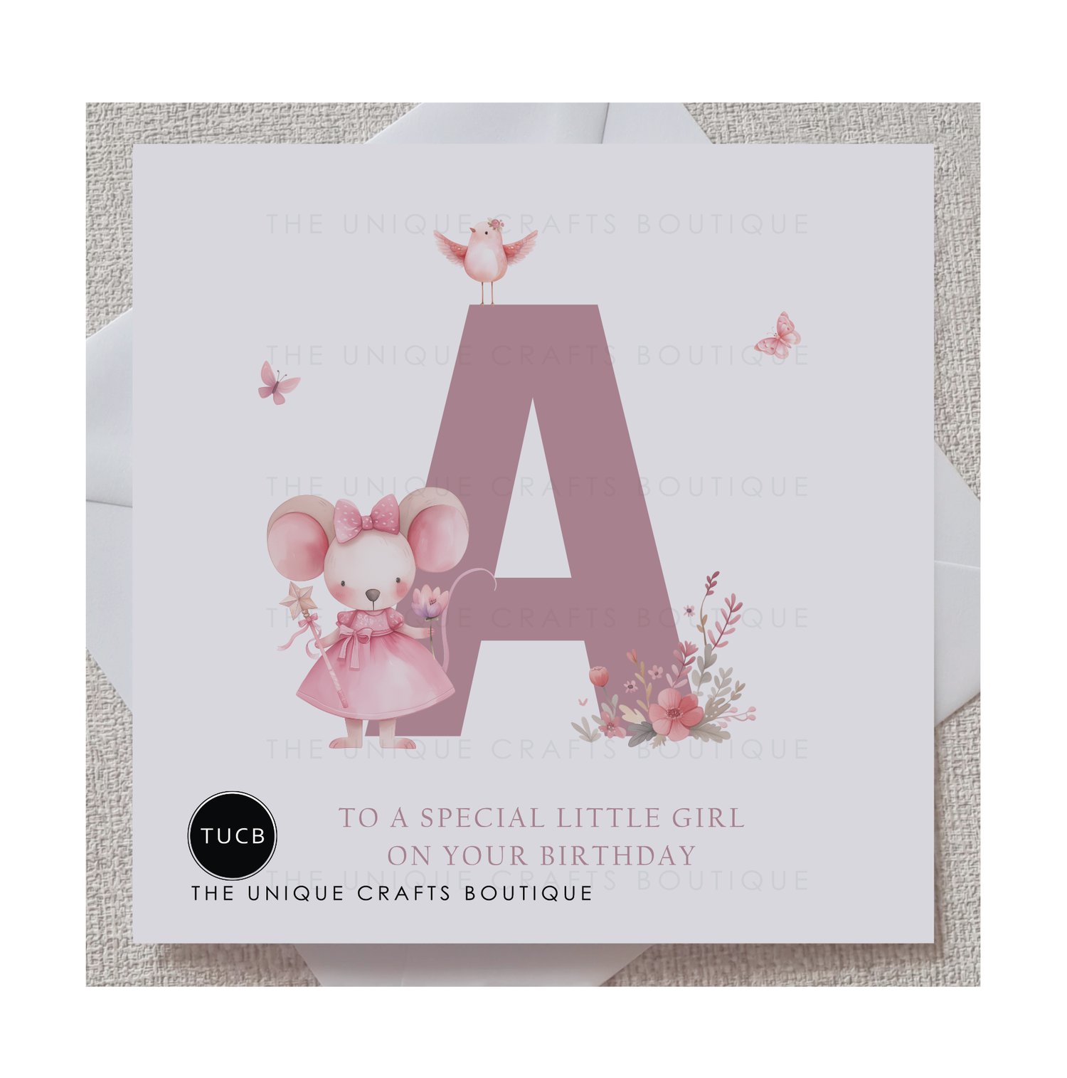 Printed with a cute little Fairy Mouse surrounded by nature and standing besides any letter of the alphabet in a muted pink shade. Displayed below is the message 'to a special little girl on your birthday'. This card is a certain to make your loved one smile.