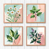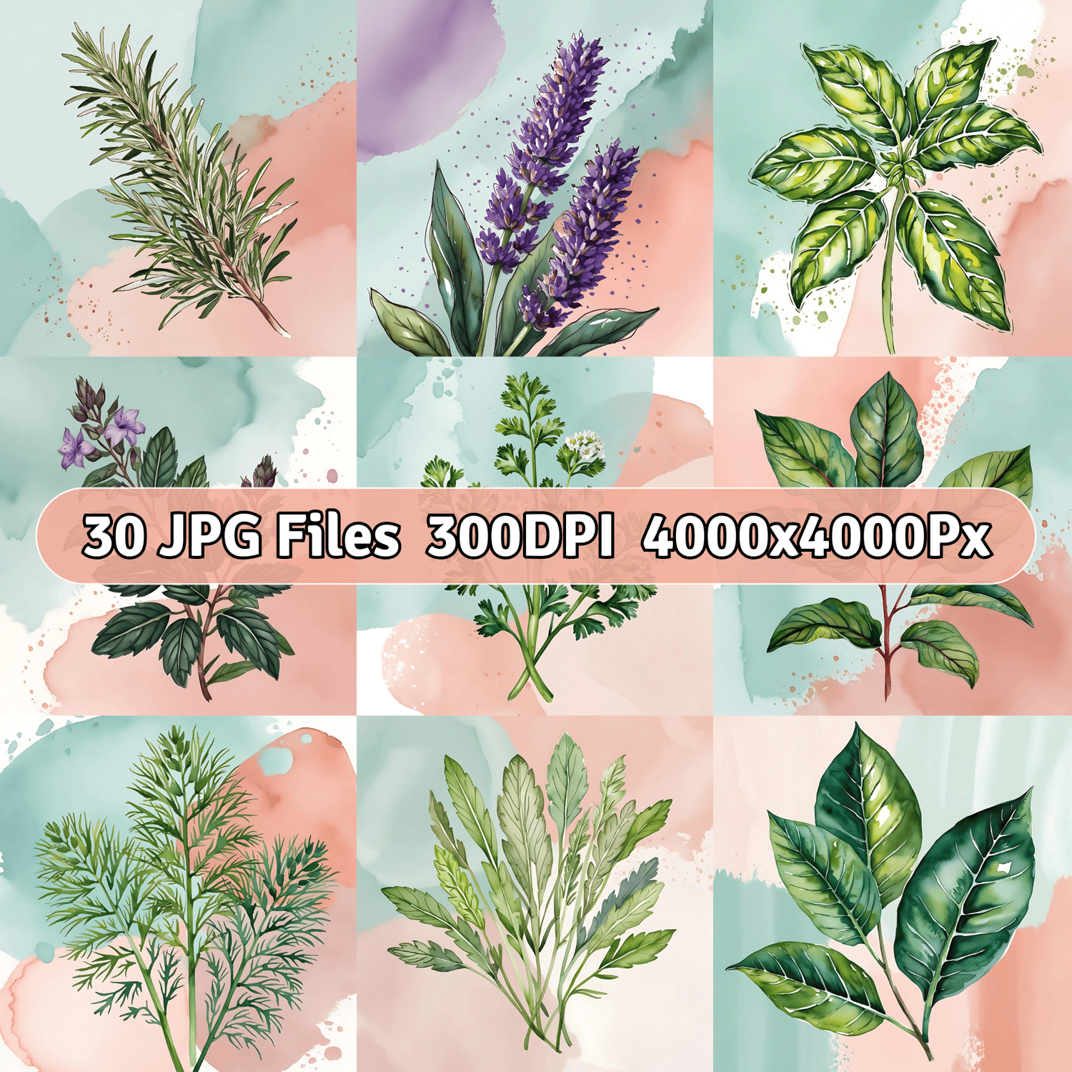 Bring gentle elegance to your digital and print designs with this collection of 30 watercolor herb illustrations set against soft pastel backgrounds of pale teal and dusty rose. Featuring herbs such as chamomile, marjoram, oregano, and more, each design combines fine botanical detail with flowing watercolor textures and faded brush strokes.