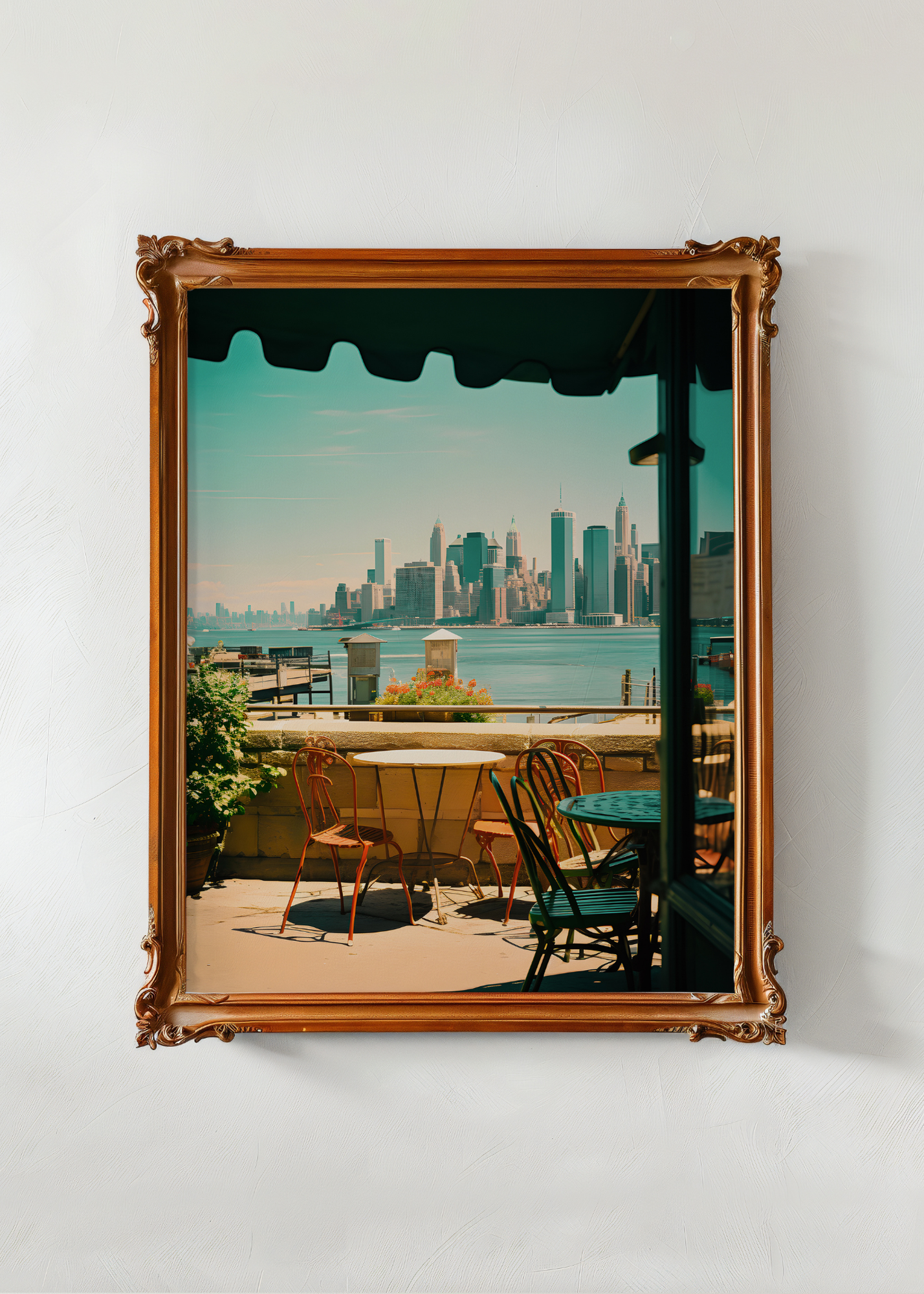 Sunday on the Hudson— Chairs sit empty on a quiet terrace, their curved backs and faded paint holding the memory of morning coffee and city stories. Across the water, the skyline rises—silver and still, softened by distance. Bougainvillea spills from flowerpots. An awning offers shade. It’s the in-between moment: before the lunch rush, after the last sip. This piece captures the hush of urban life when it pauses to breathe. A love letter to New York, viewed from a peaceful perch.