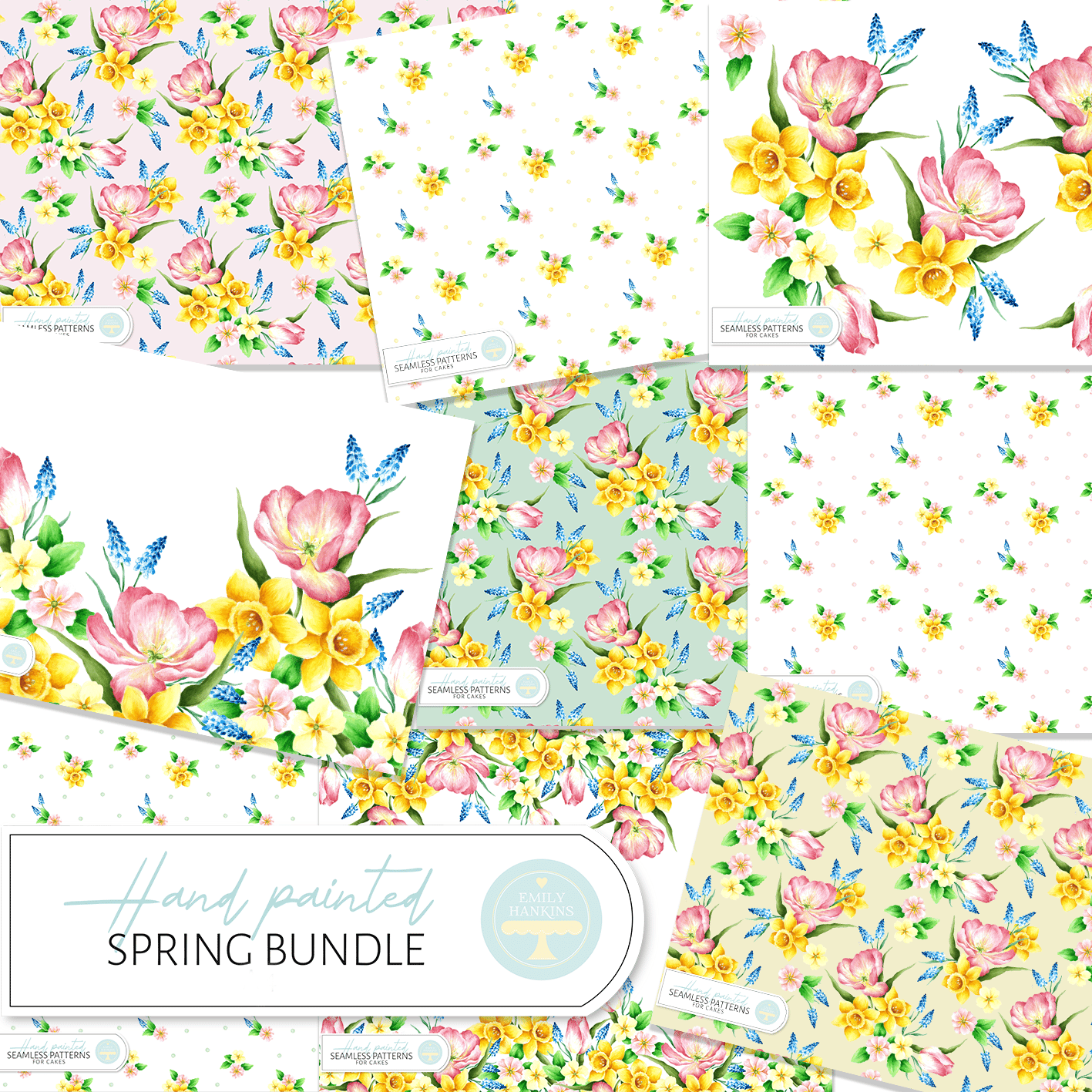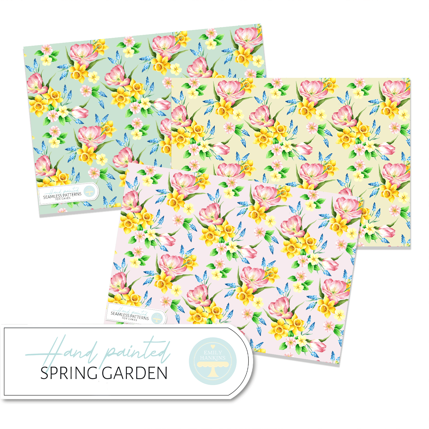The designs are inspired by the joy of a colourful spring garden after the long dark winter! They feature tulips, daffodils, muscari and primroses in various designs on various backgrounds (See each individual design for more details!) Each flower has been hand painted by Emily and painstakingly crafted into a seamless pattern for your cake designs.