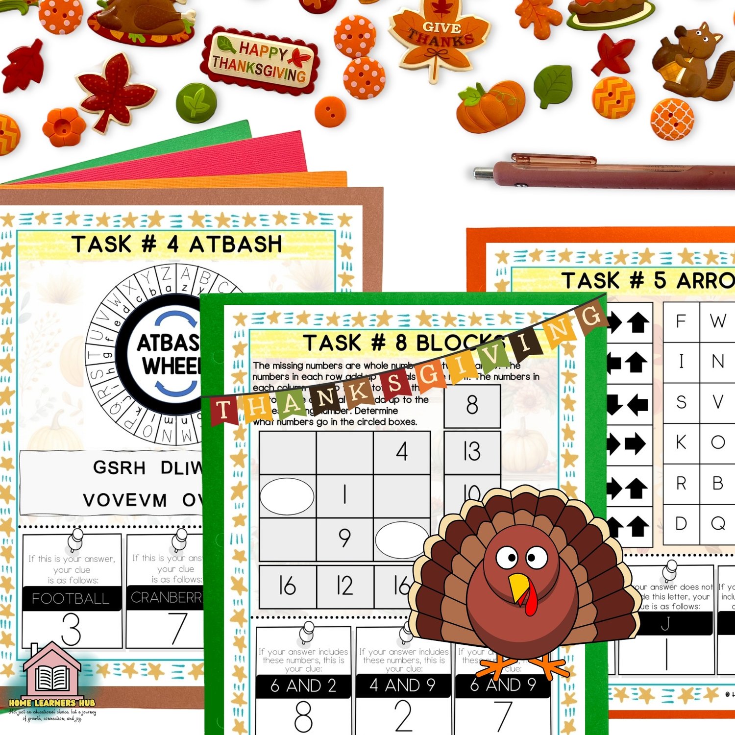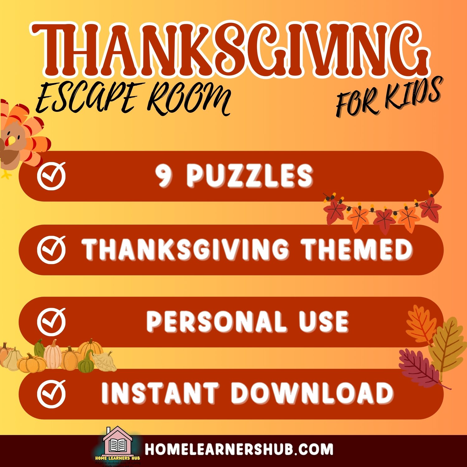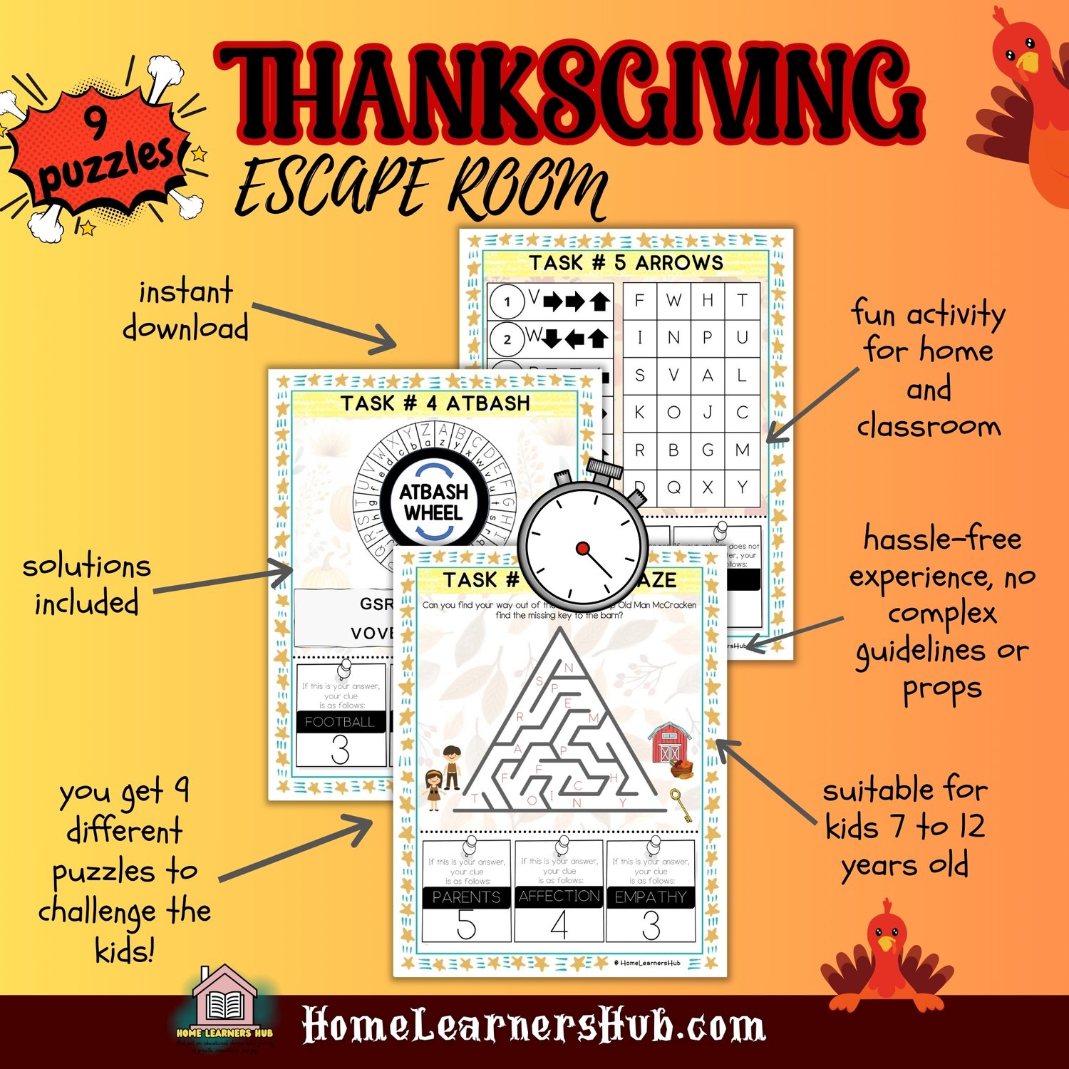 Are you ready for an exciting Thanksgiving adventure? Introducing our Thanksgiving Escape Room Kit! This engaging, printable game features 9 festive puzzle challenges that conclude with a secret final 4-digit code, making it the perfect Thanksgiving activity for children aged 7 to 12.