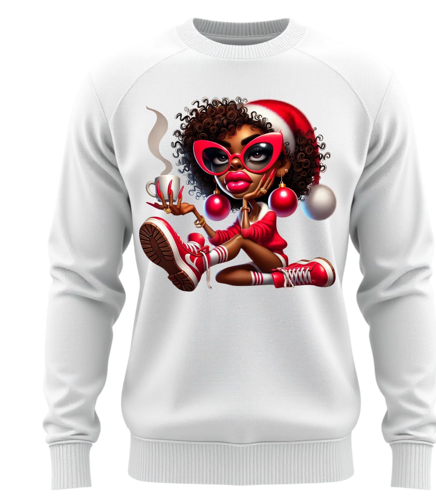 The image showcases a white sweatshirt featuring a striking design of a stylish chibi African American woman. She has a confident, laid-back vibe with curly hair adorned by a Santa hat. Her large, expressive eyes are highlighted by oversized red cat-eye glasses, and she has full, glossy pink lips. She wears statement red ball earrings that resemble Christmas ornaments, matching her festive aesthetic.