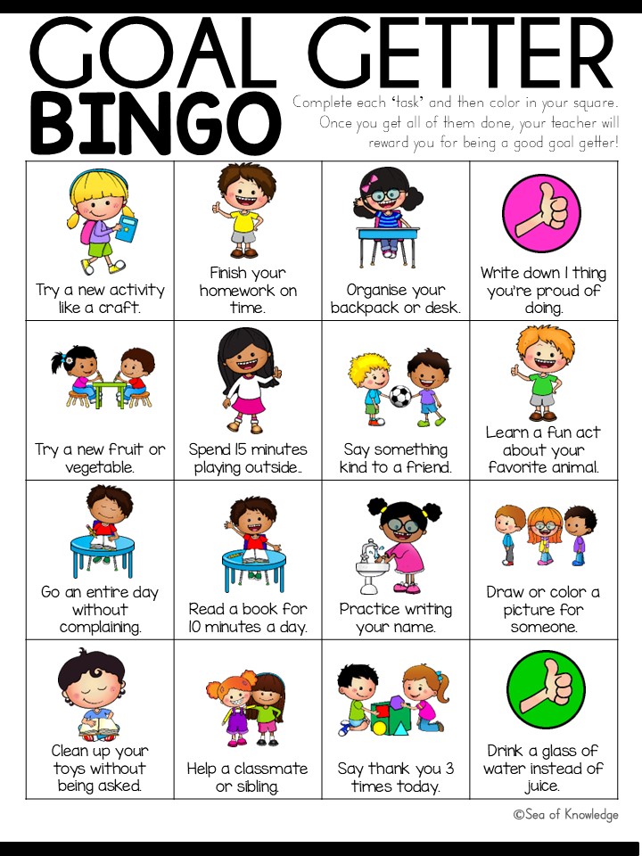 Each bingo square encourages a thoughtful action, like "I want to eat more vegetables" "make a new friend," or "finish my homework."