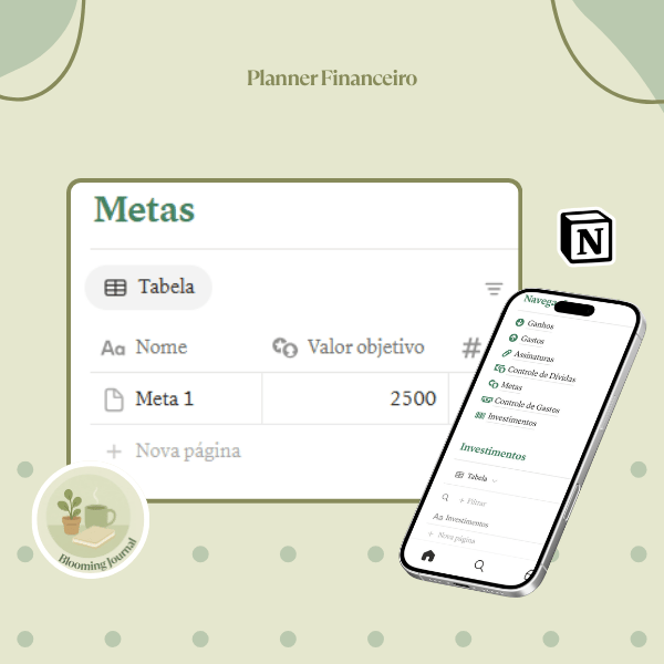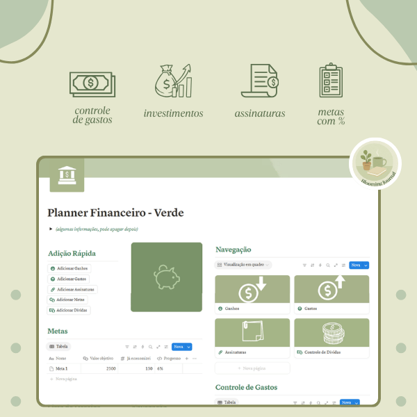 Este template reúne diferentes partes da sua vida financeira em um único espaço dentro do Notion, facilitando o acompanhamento de ganhos, gastos e metas no dia a dia!