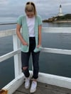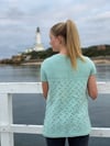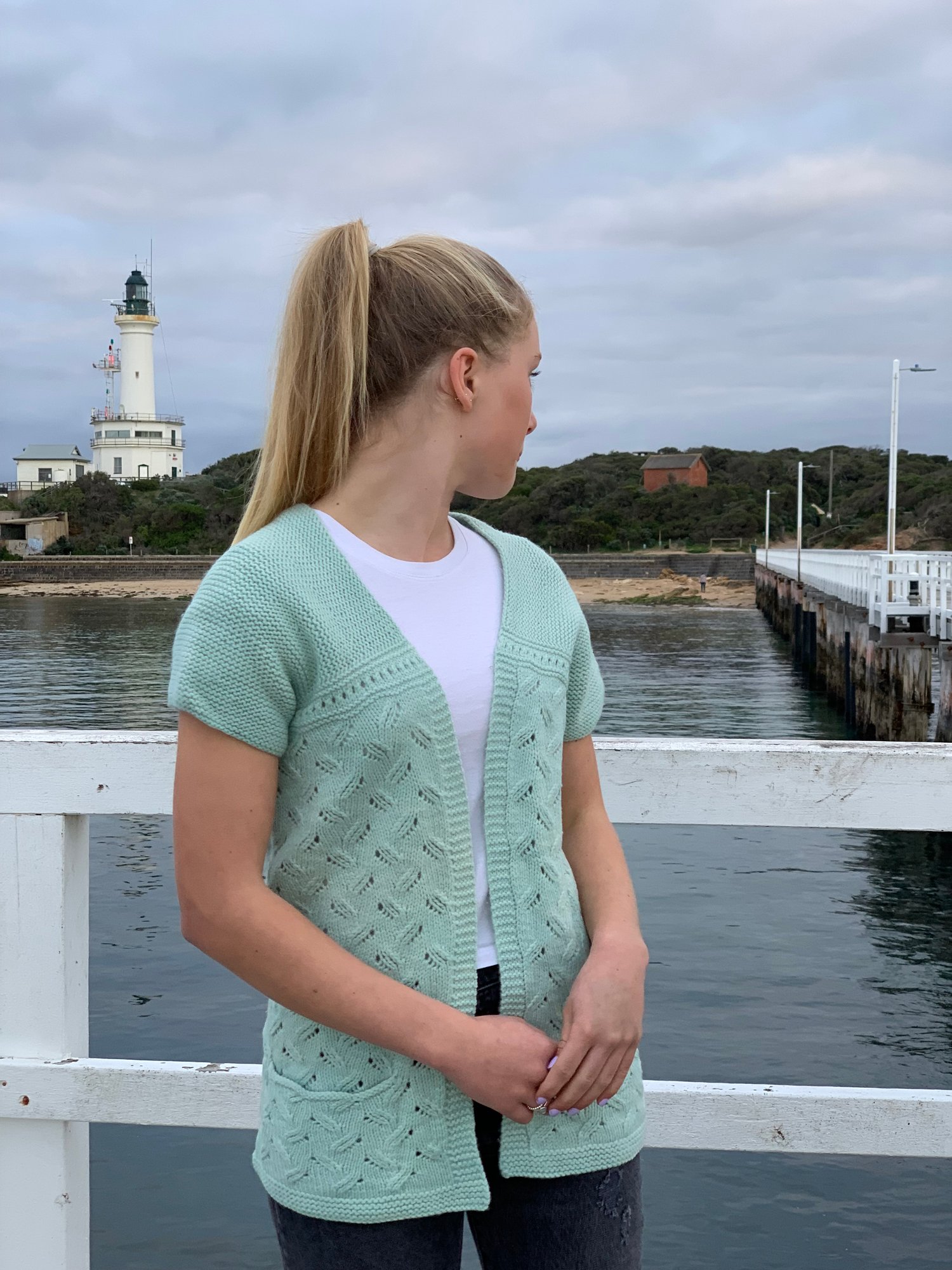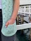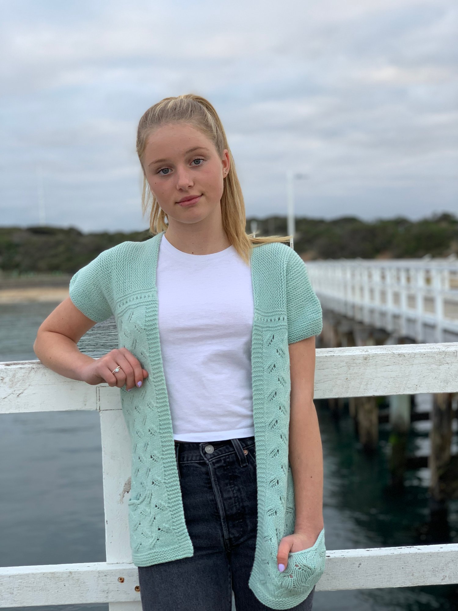 Light as air and full of charm, Maree will be your new favourite layer for breezy mornings and golden afternoons. Maree captures the delicate elegance of a summer breeze with its flowing lace motif, gentle shaping, and soft short sleeves. This cardigan features a beautiful openwork leaf pattern adding a touch of nature-inspired grace to any outfit. Designed to be worn open, the cardigan pairs effortlessly with sundresses, camisoles, or casual tees. The garter stitch sleeves and edging lend structure while keeping the overall look relaxed and wearable. Deep, cozy pockets offer practicality without sacrificing style, and the seamless construction ensures a smooth, flattering fit.