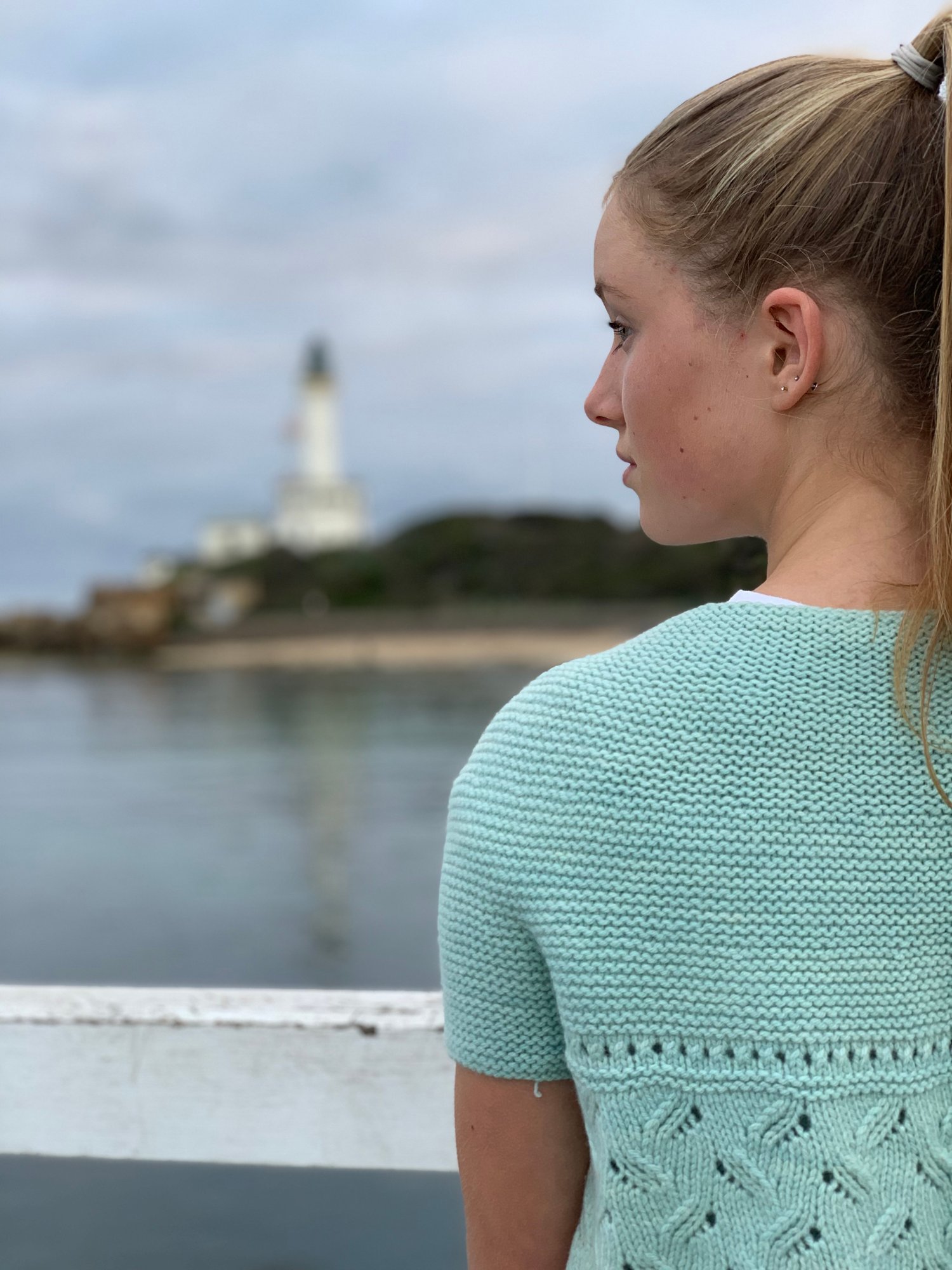 The garter stitch yoke leads into a row of eyelets that allow the wearer to create a fastening if desired.