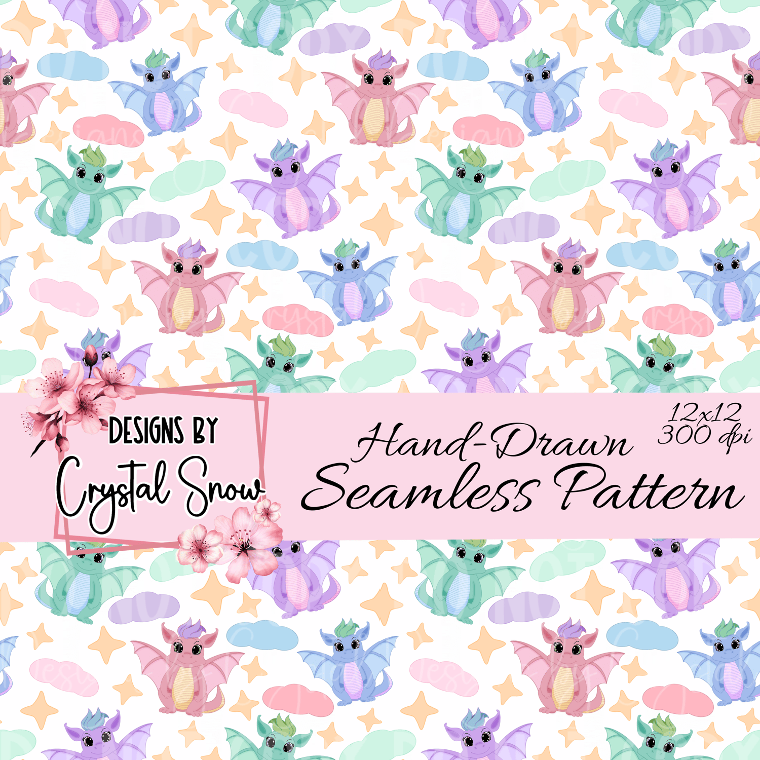 This seamless baby dragon pattern is bursting with charm! Hand-drawn in a cute kawaii style, it’s great for kids’ room décor, fabric, planners, stickers, and scrapbooking. The fantasy theme makes it versatile for crafts, sublimation, or even custom gifts.