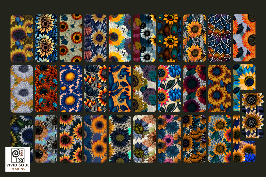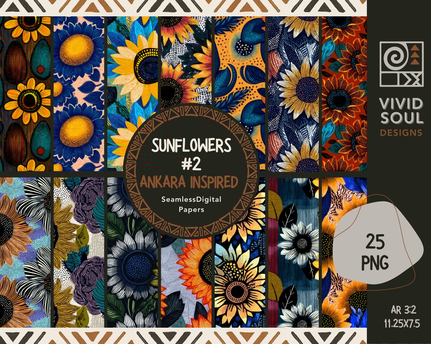 Bring warmth, power, and positivity to your next creative project with this radiant collection of 30 seamless sunflower-themed Ankara-inspired patterns. Each image is a high-resolution PNG file (2160x1440 px), perfect for sublimation printing, apparel design, planner backgrounds, digital scrapbooking, packaging, and more.