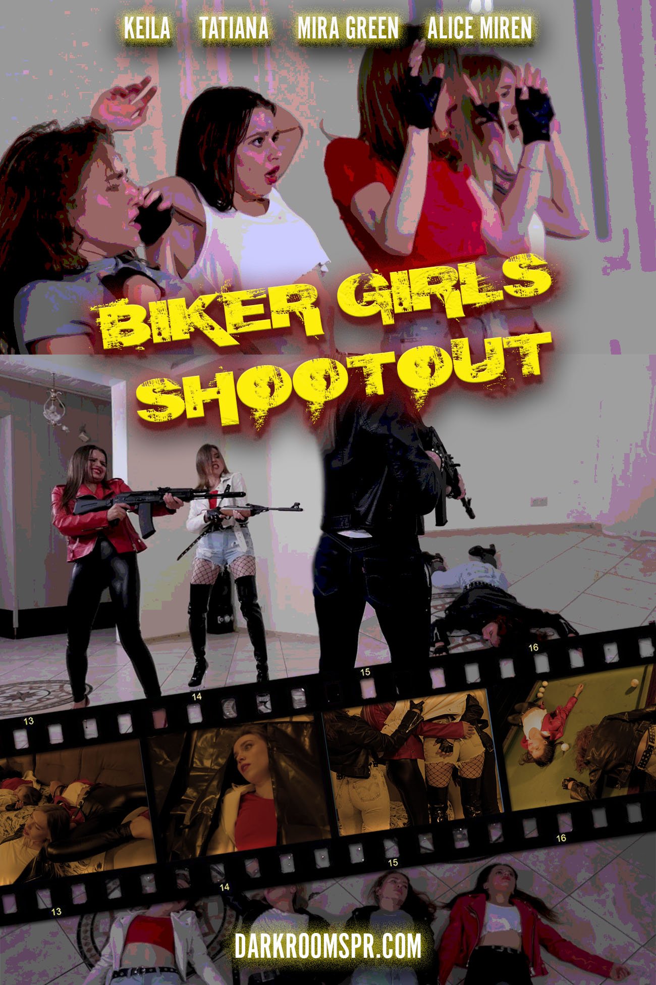 All four girls are in a gun fight with an off-camera gunman. They take cover behind some boxes or similar. Then Mira tries to change position and moves in front of one of the boxes. As she is about to pass the box when she gets hit multiple times by the machine gun and falls backwards on the box. Kelia is taking cover behind that same box as Mira is laying on top off. She shouts out the name of Mira that just got shoot and killed. Kelia then gets up to try to shoot back at the gunman. While Kelia is shooting back, Mira’s body gets hit multiple times in the crossfire. Then Kelia, also gets hit several times and she falls on top of the box too, but on her stomach. Tanya also tries to shoot back at the gunman, but she also gets riddled in her chest and falls on top another box. Alice then tries to surrender since she is the only one left. She gets out of cover and walks so she is in front of the box with Tanya dead on it. Then she gets riddled with machine gun bullets. She ends up sitting leaning against the box. She sits there dying slowly, moaning in pain and clutching her wounds on her chest and stomach. Then the gunman shoots them again. They shake from the multiple bullet hits in their bodies. After the shooting finally stops, we get some views for their bodies. Have all girls’ eyes and mouths be open while filming their bodies.