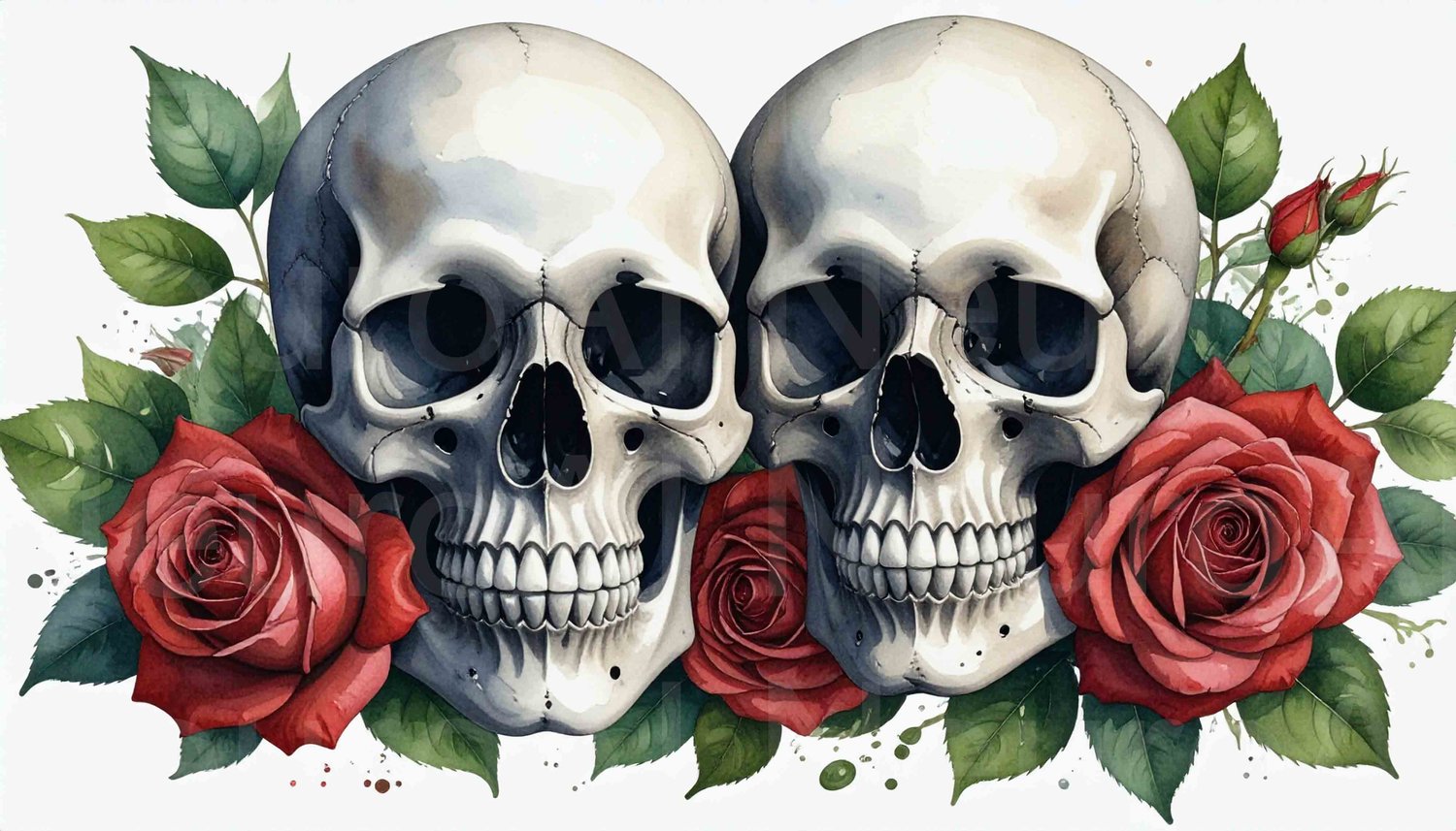 Romantic gothic skulls surrounded by red roses