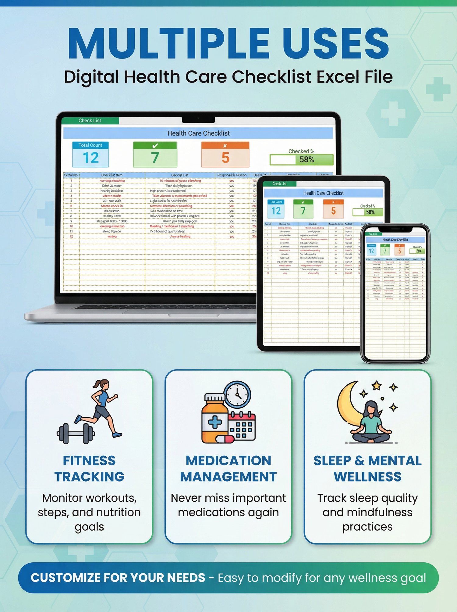 Take control of your wellness routine with this Editable Health Care Checklist (Excel Template) — a simple, clean, and fully customizable tool designed to help you stay consistent and motivated every single day.