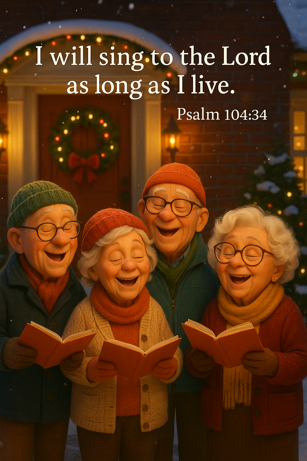 Celebrate lifelong praise and festive fellowship with this Christian wall art featuring Psalm 104:34. Four elderly carolers sing joyfully outside a snow-covered home adorned with Christmas lights and a wreath, holding songbooks under a starry winter sky. This printable honors enduring worship, community, and seasonal joyβperfect for Christmas scripture decor, ministry bundles, devotional gifts, and inspirational holiday printables.