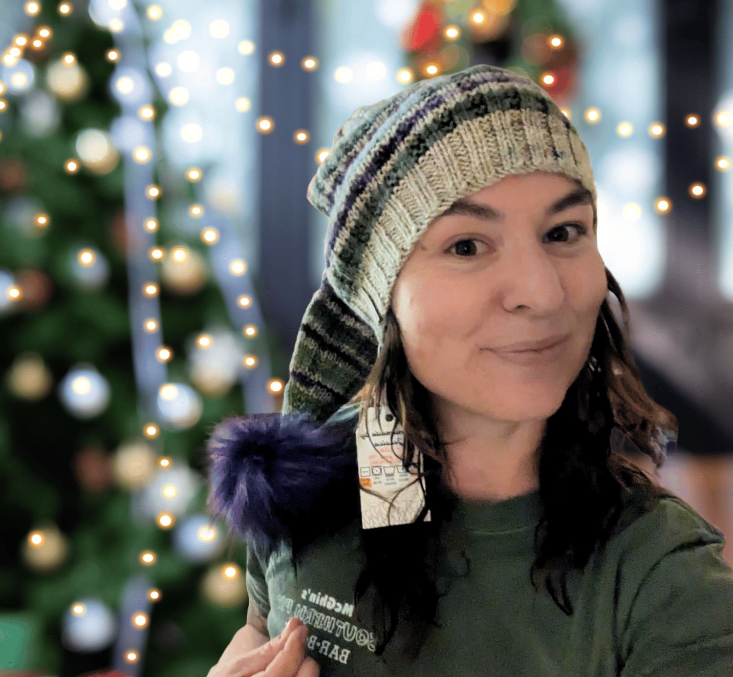 It’s easy to customize, too, if you want a longer stocking cap or if the traditional red and white color scheme isn’t your thing—one tester made a gorgeous purple “elf” hat, and I made a stripey green one for a friend.
