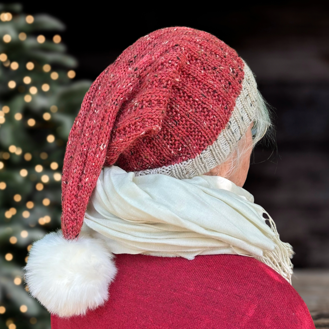 In 2022, a friend from my local knitting group was approached by a family member in the movie biz about making a critical piece of Saint Nick’s costume for an upcoming film: the iconic stocking cap. It was more work than one knitter could do, so I was recruited to make one of the two hat designs.