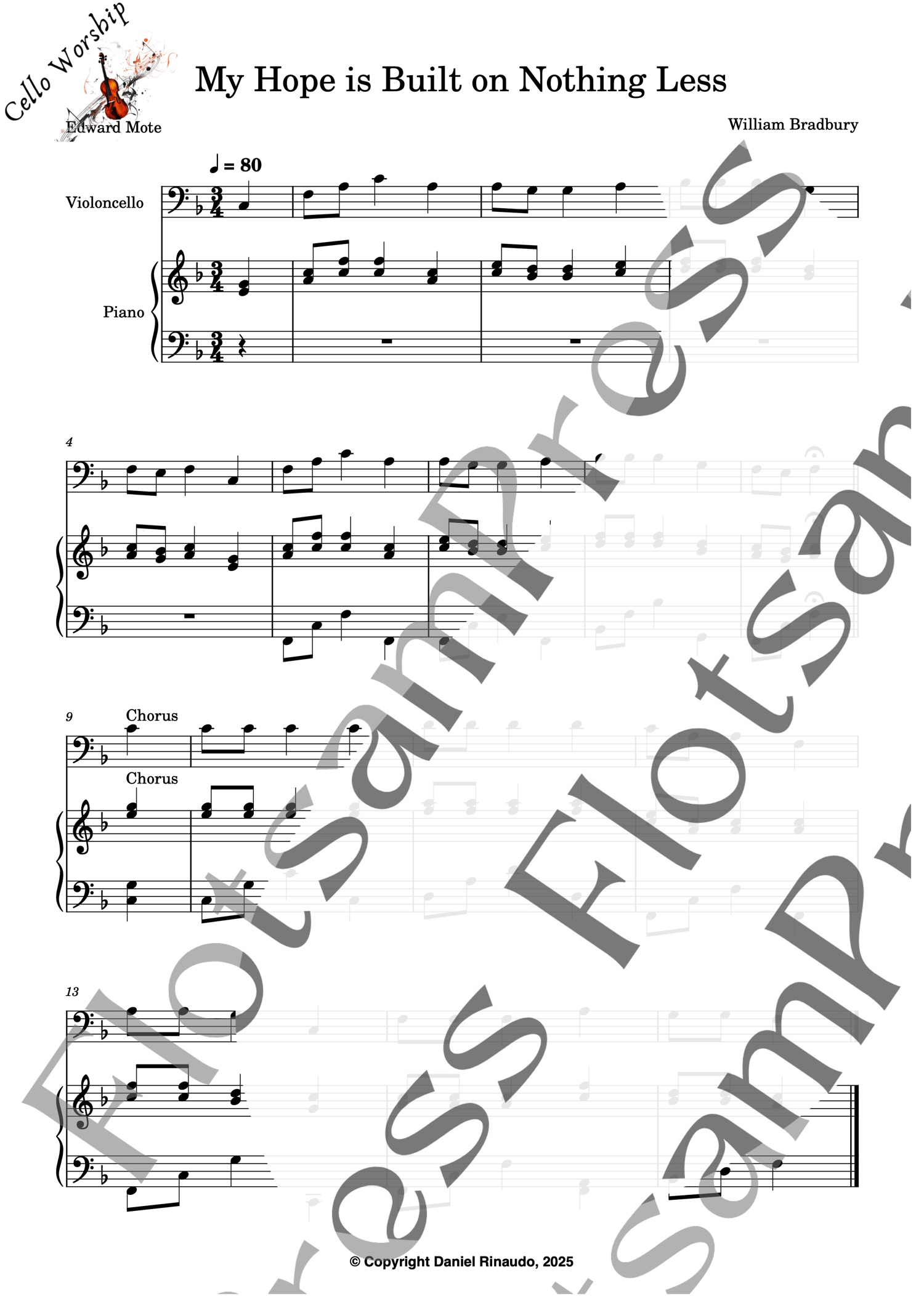 This arrangement of My Hope is Built on Nothing Less is written for beginner to lower-intermediate cello players, with a simple and supportive piano accompaniment. Perfect for church services, lessons, or home practice.