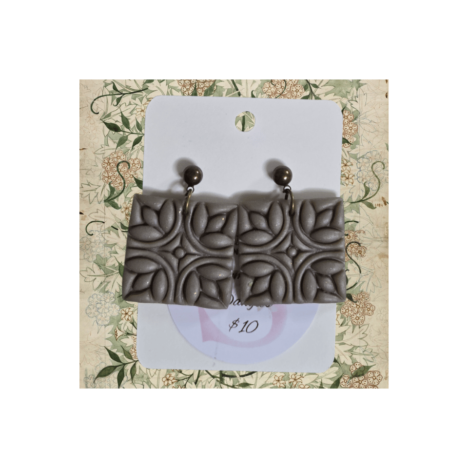 These handmade polymer clay earrings feature a soft, sculpted floral design in a muted taupe-gray tone with a subtle shimmer. Each piece is lightweight and comfortable for all-day wear, hanging from a sparkly gold circle post that adds just the right touch of shine.