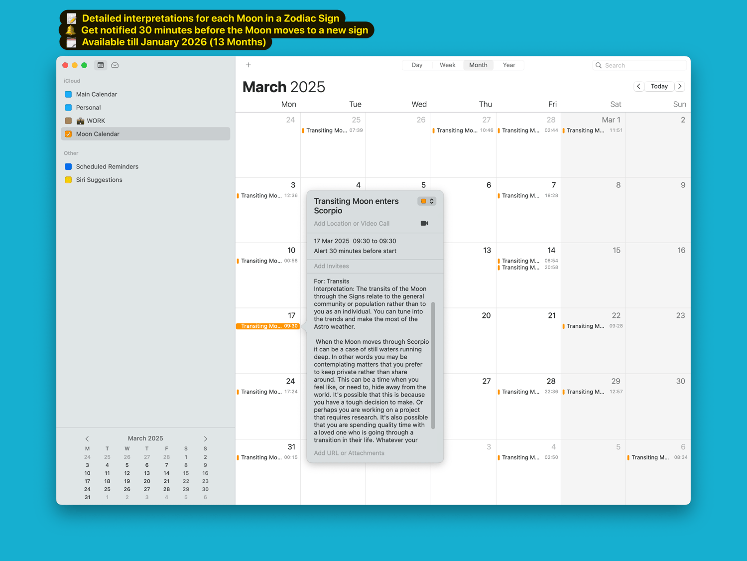- Detailed Descriptions: Easy-to-read interpretations for every lunar transit.