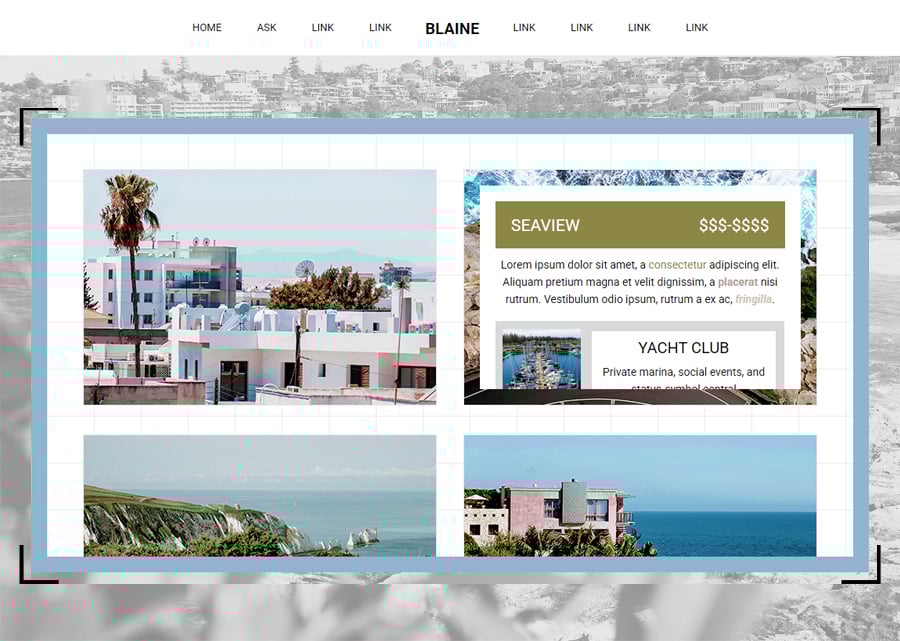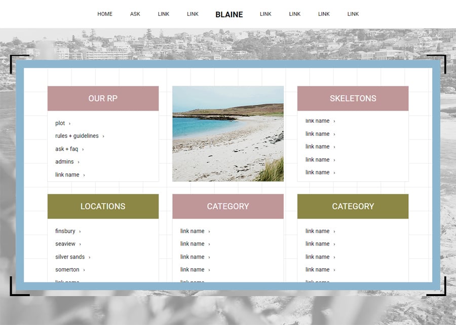 Static previews for "Blaine" can be viewed at the following: plot/guidelines, faq + ask/submit, characters, locations, neighborhoods & navigation