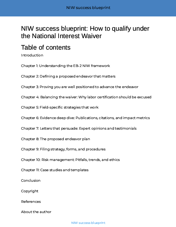 "NIW Success Blueprint" is your essential guide to navigating the National Interest Waiver process, transforming your professional achievements into a pathway for permanent residency in the U.S. This practical playbook offers a clear strategy for aligning your evidence with legal standards, addressing common pitfalls, and articulating your unique contributions across various fields. With case studies included, you'll be empowered to create a compelling petition that demonstrates the national importance of your work.