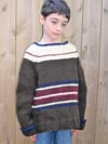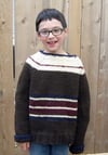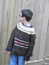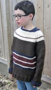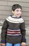 Freestyle Super: a super bulky child’s raglan sweater featuring whatever colors your kid chooses! Knit in 4 colors (or more) from the bottom up in the round, this design uses written instructions, a schematic, and some tips on personalizing your striping choices. The sweater is completely reversible. If the kid spills on the front…turn it around. It requires virtually no sewing at the end, just weaving in ends and joining up the underarm stitches. Freestyle Super uses a Super Bulky weight yarn that knits at 11 sts = 4”/10 cm after blocking on a size US 10.75 (7mm) needle. This pattern requires the knitter to increase, decrease, and play with color.