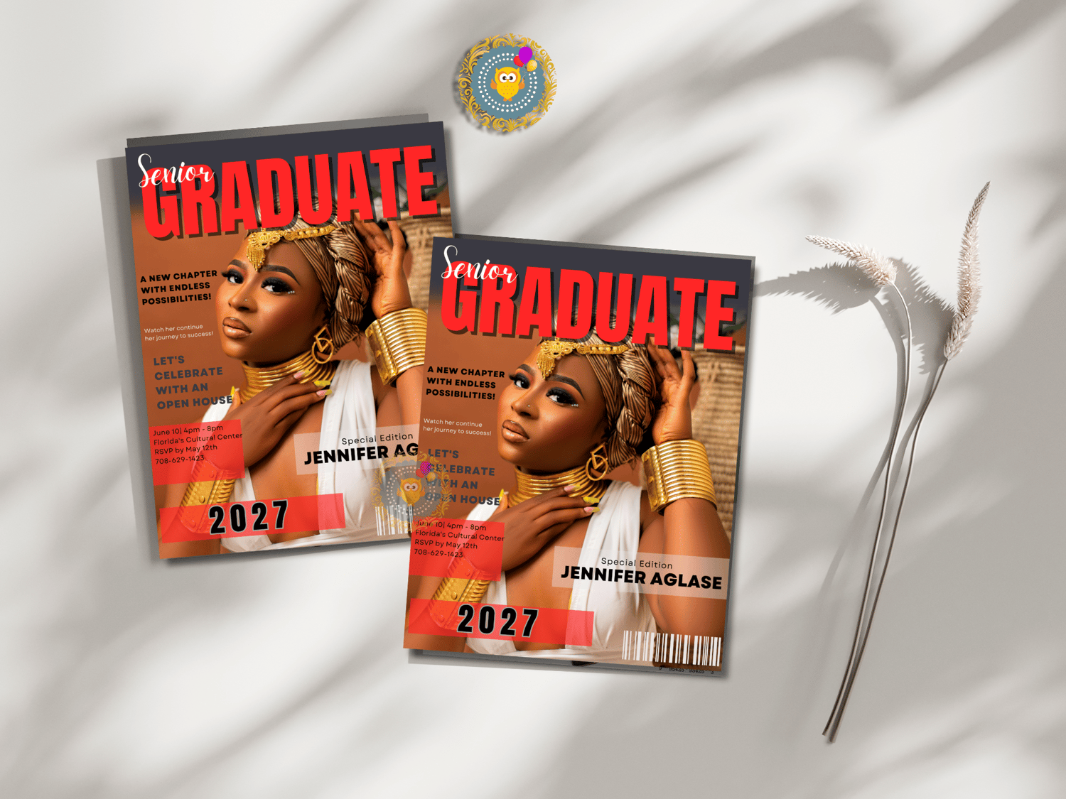 Celebrate your grad in style! Invite your guests with our beautiful invitation, magazine style. Your invitation sets the tone to your event! Want to D.I.Y., then this is the perfect template for you. Check out the pictures above to see what all you will be able to edit.