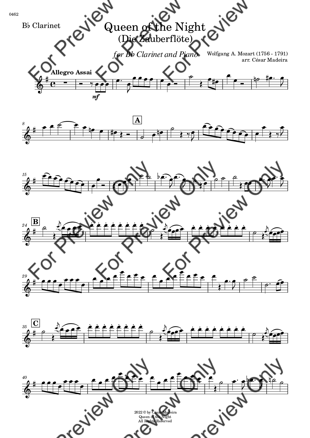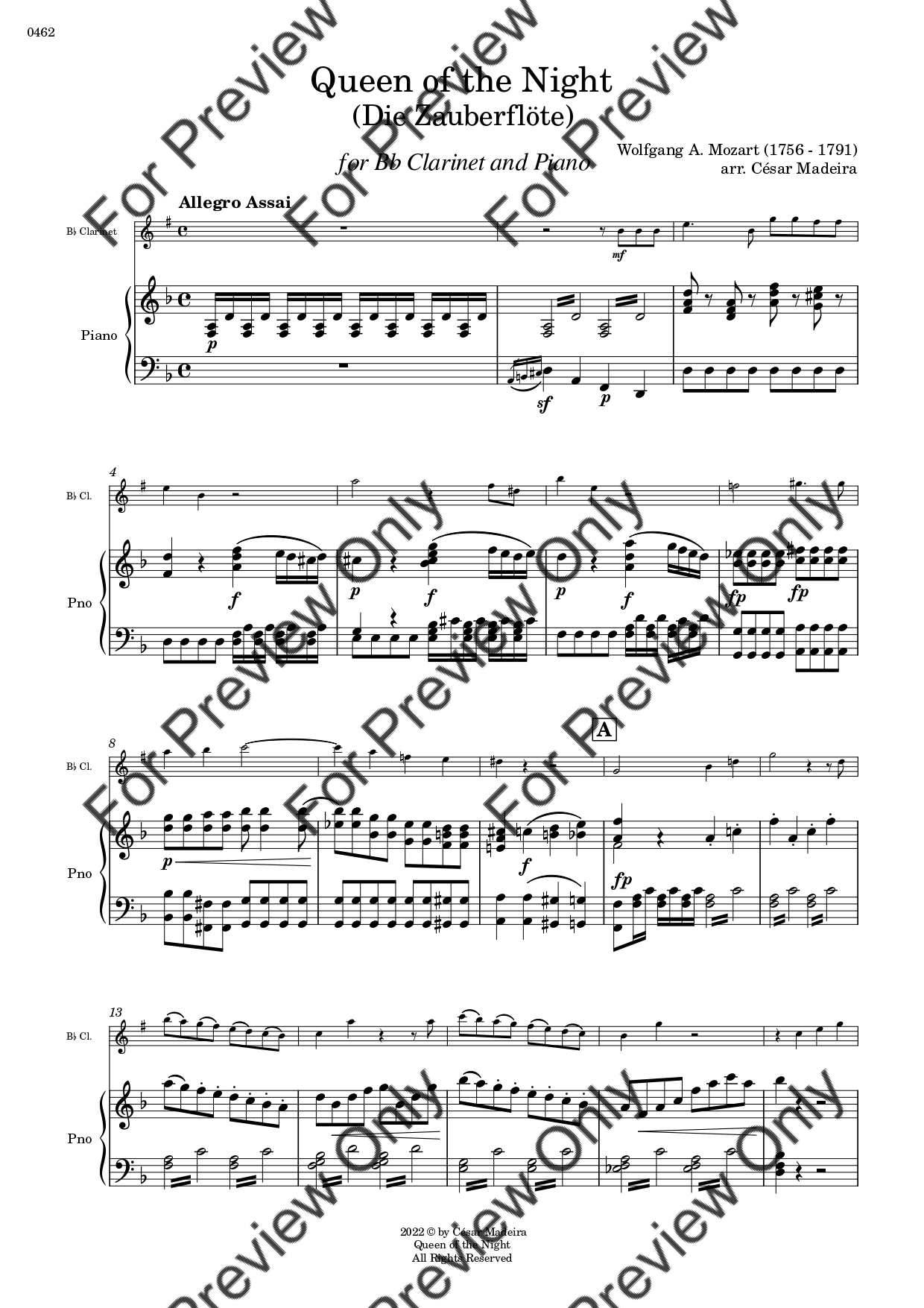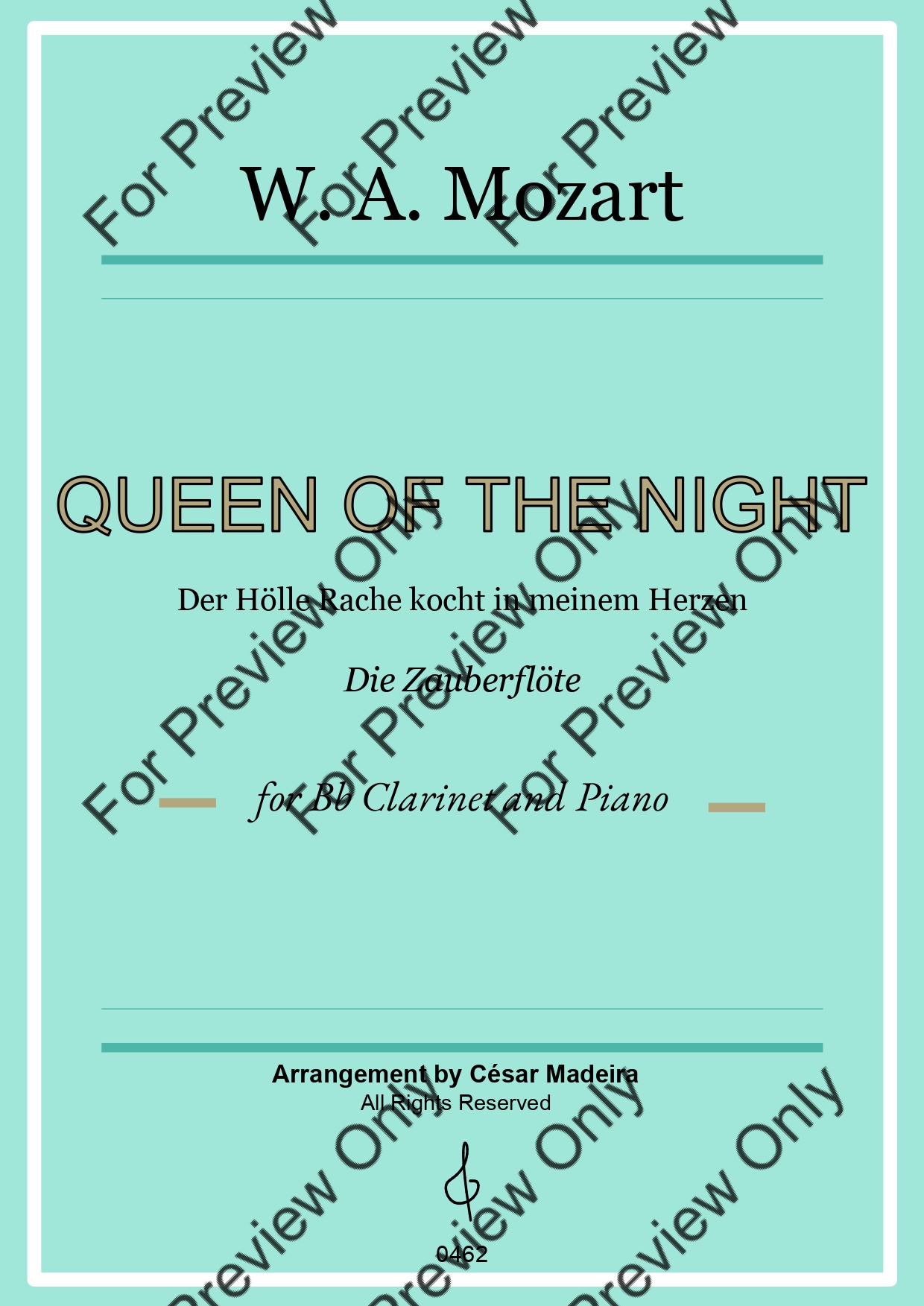 Queen of the Night from Die Zauberflote (The Magic Flute) by Wolfgang Amadeus Mozart. Arrangement for Bb Clarinet and Piano. With Full Score and Individual Parts. Have fun!