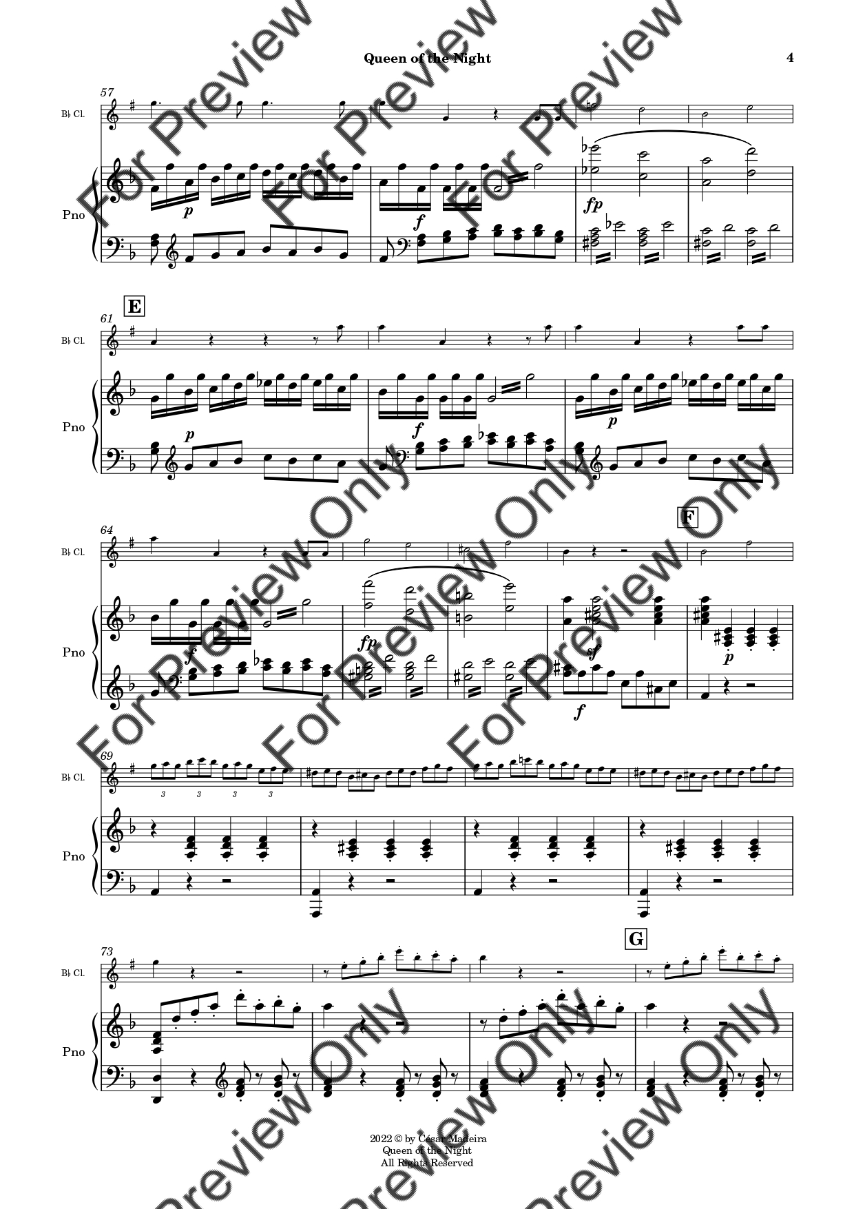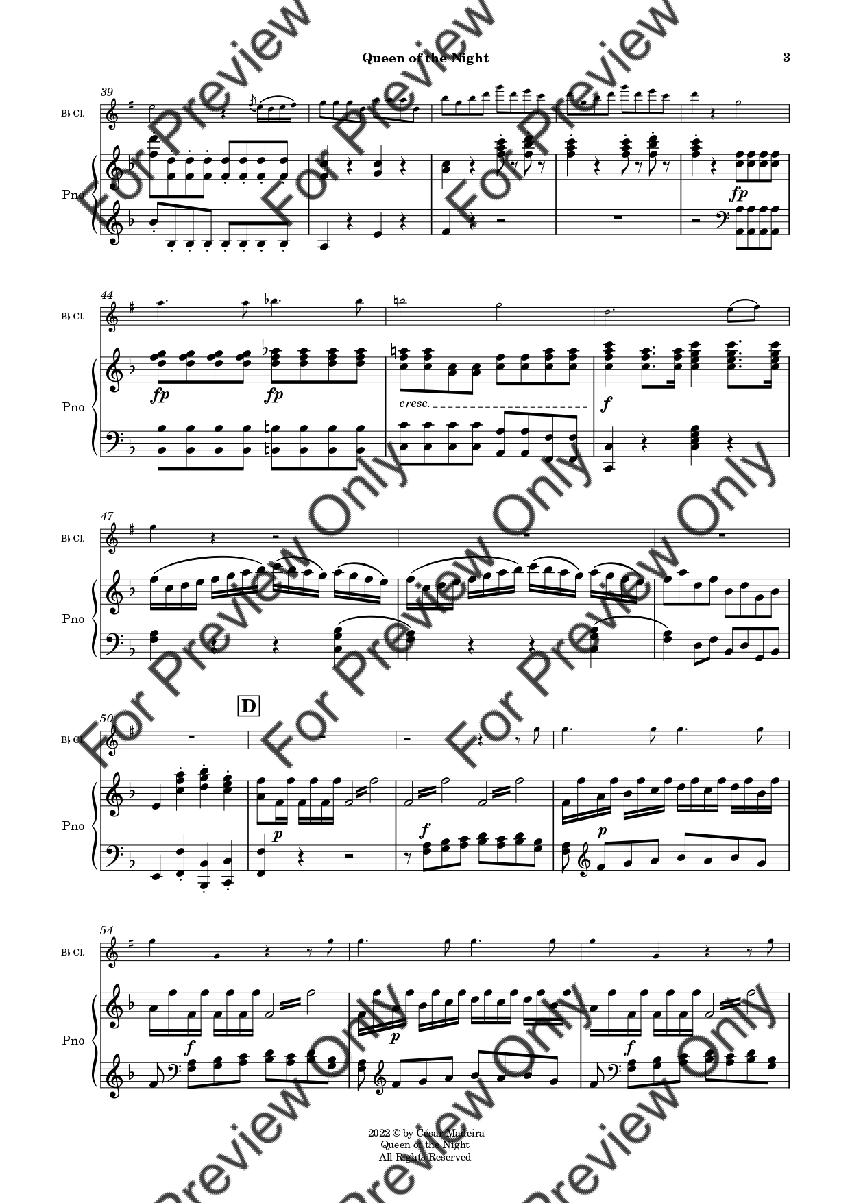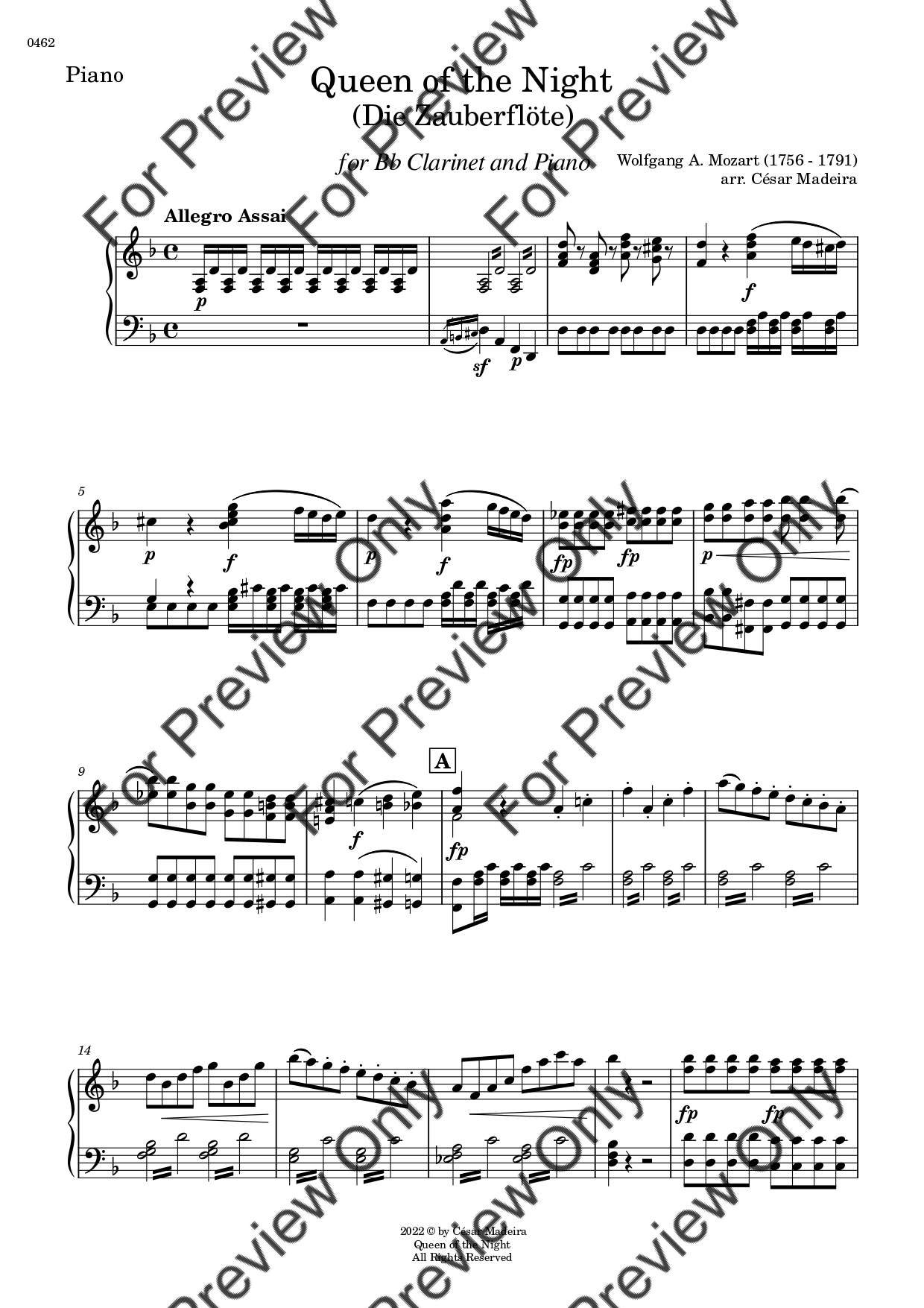 Queen of the Night from Die Zauberflote (The Magic Flute) by Wolfgang Amadeus Mozart. Arrangement for Bb Clarinet and Piano. With Full Score and Individual Parts. Have fun!