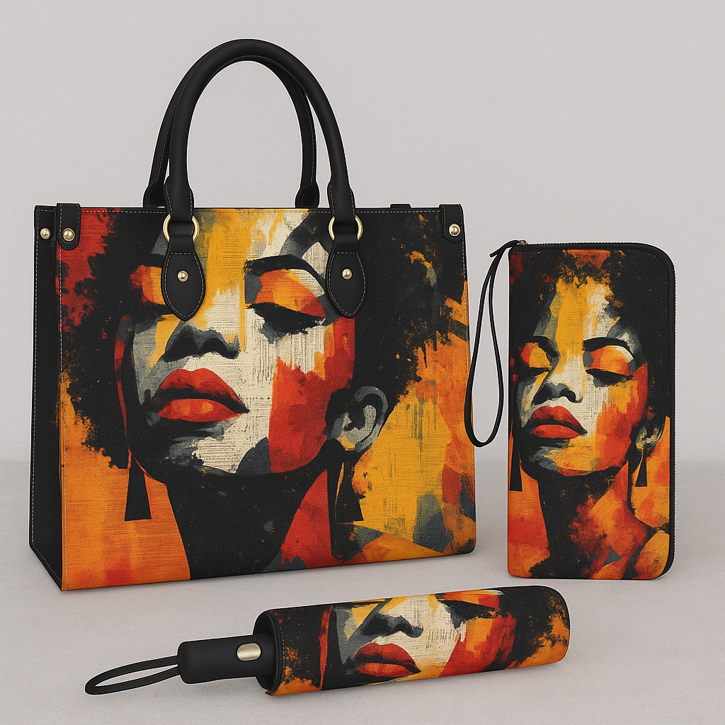 Step into the spotlight with the Fierce Expression Collection β a stunning trio of fashion-forward accessories that are nothing short of a vibe! Featuring a vividly expressive artwork of a powerful Black woman in bold Afro-urban hues, this set is guaranteed to turn heads and spark conversations.
