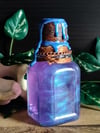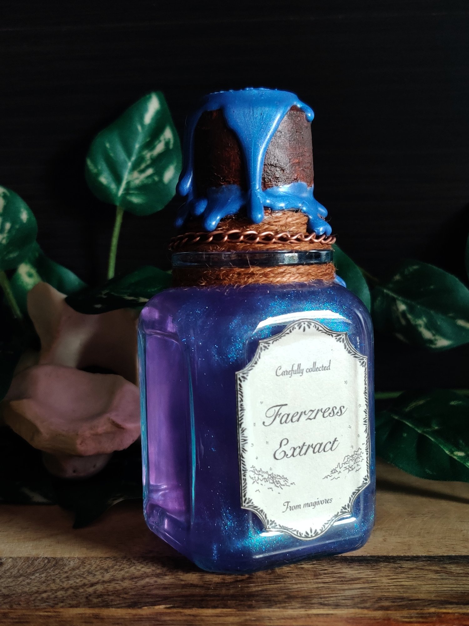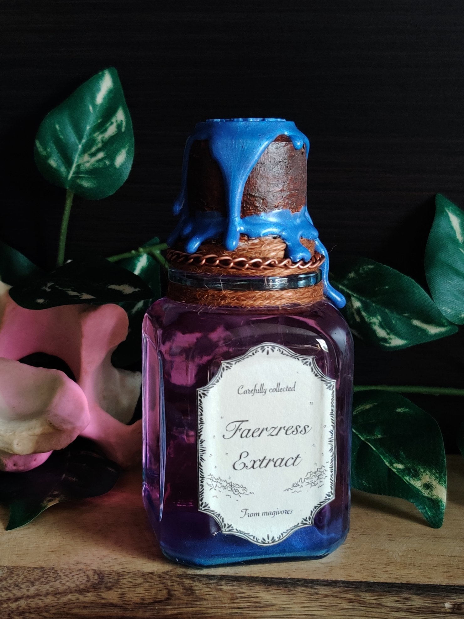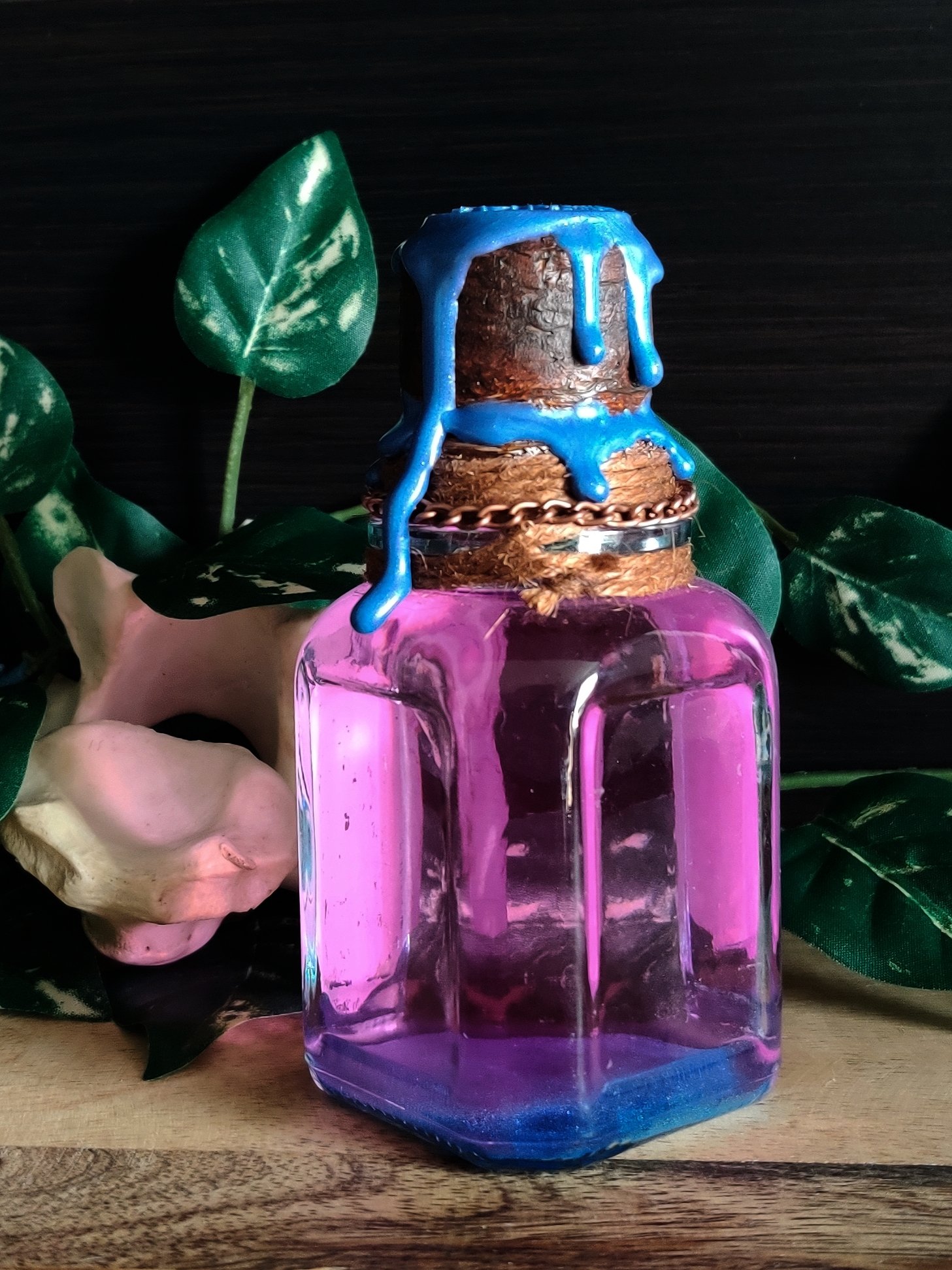 Pullossa on purppuran sävyistä nestettä ja se on koristeltu käsintehdyllä etiketillä, juuttinarulla sekä kupariketjulla.