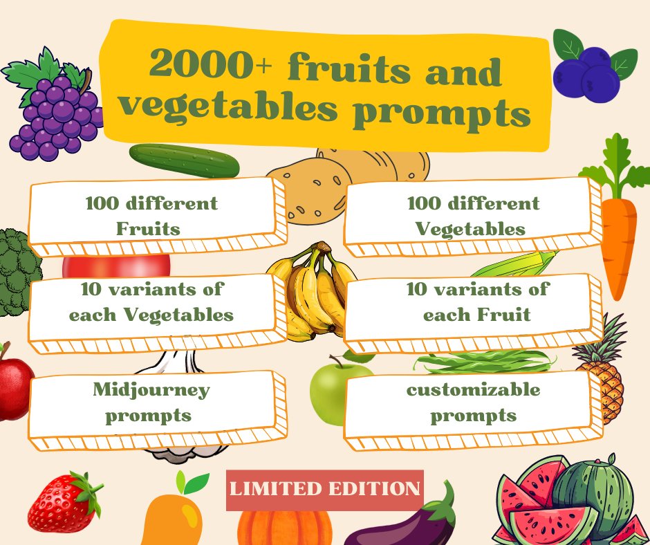 - 2040 Unique Prompts: A diverse mix of prompts for 100 fruits and 104 vegetables, each with 10 distinct prompts to inspire highly detailed AI-generated images.