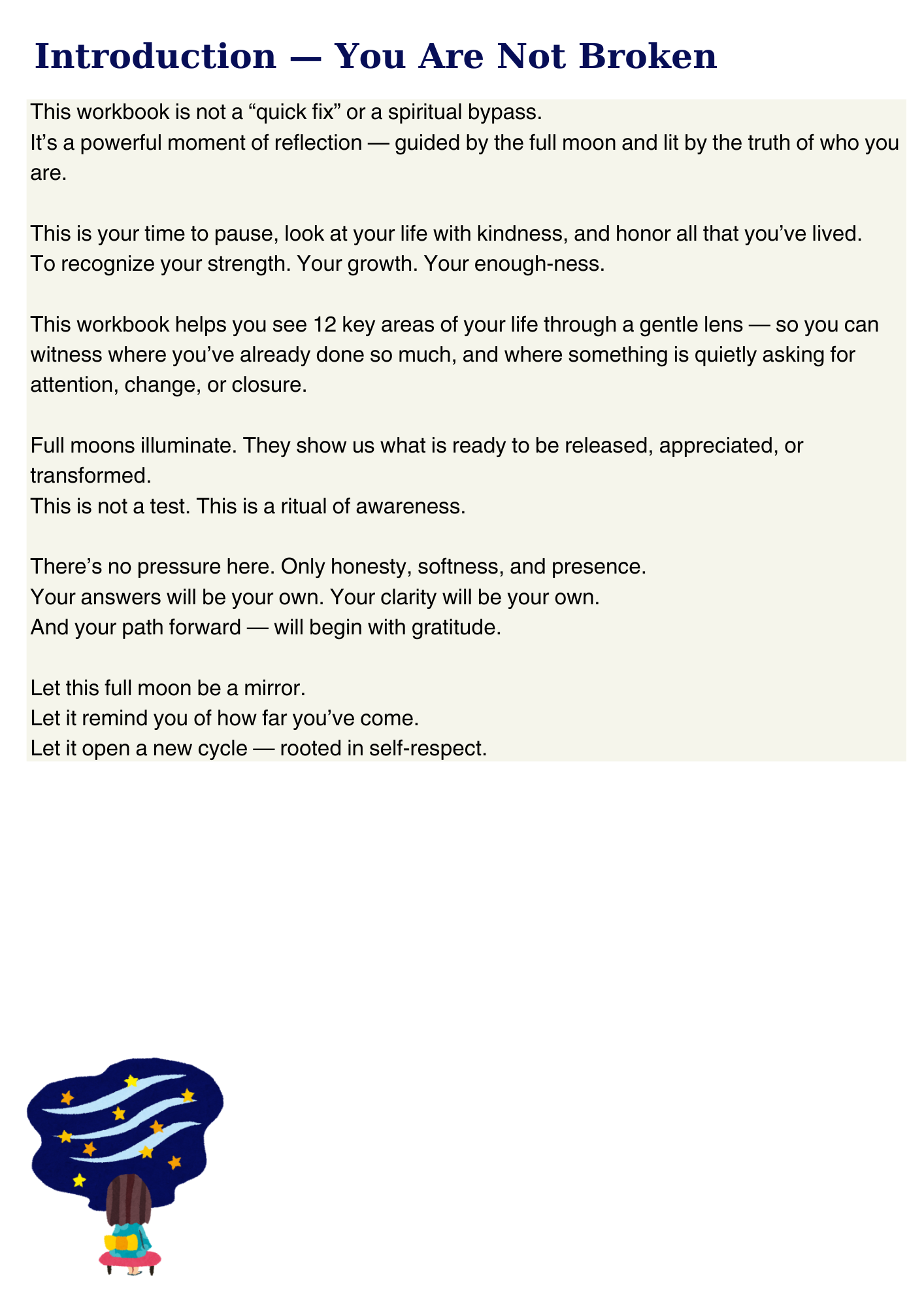 The Full Moon Transformation Guide is a beautifully crafted 12-step workbook designed to help you: