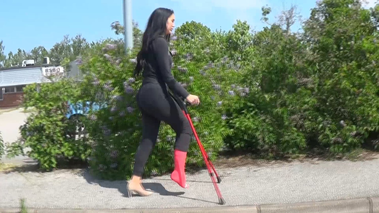 Flower saves the best for last. She puts on a sexy high heel shoe on her good foot and starts crutching along the pavement. As you probably know Flower is a crutching pro so a heel will not be a problem for her. Just enjoy pure crutching with a sexy heel!