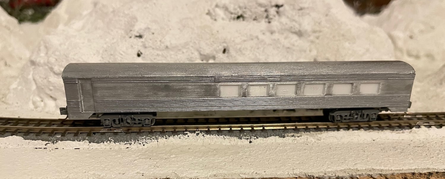 This is a model of an 80’ passenger dining car with fluted sides similar to those operated by Rock Island railroad. The trucks/couplers I suggest for this model are Micro-Trains #959 or 959-A (aluminum).