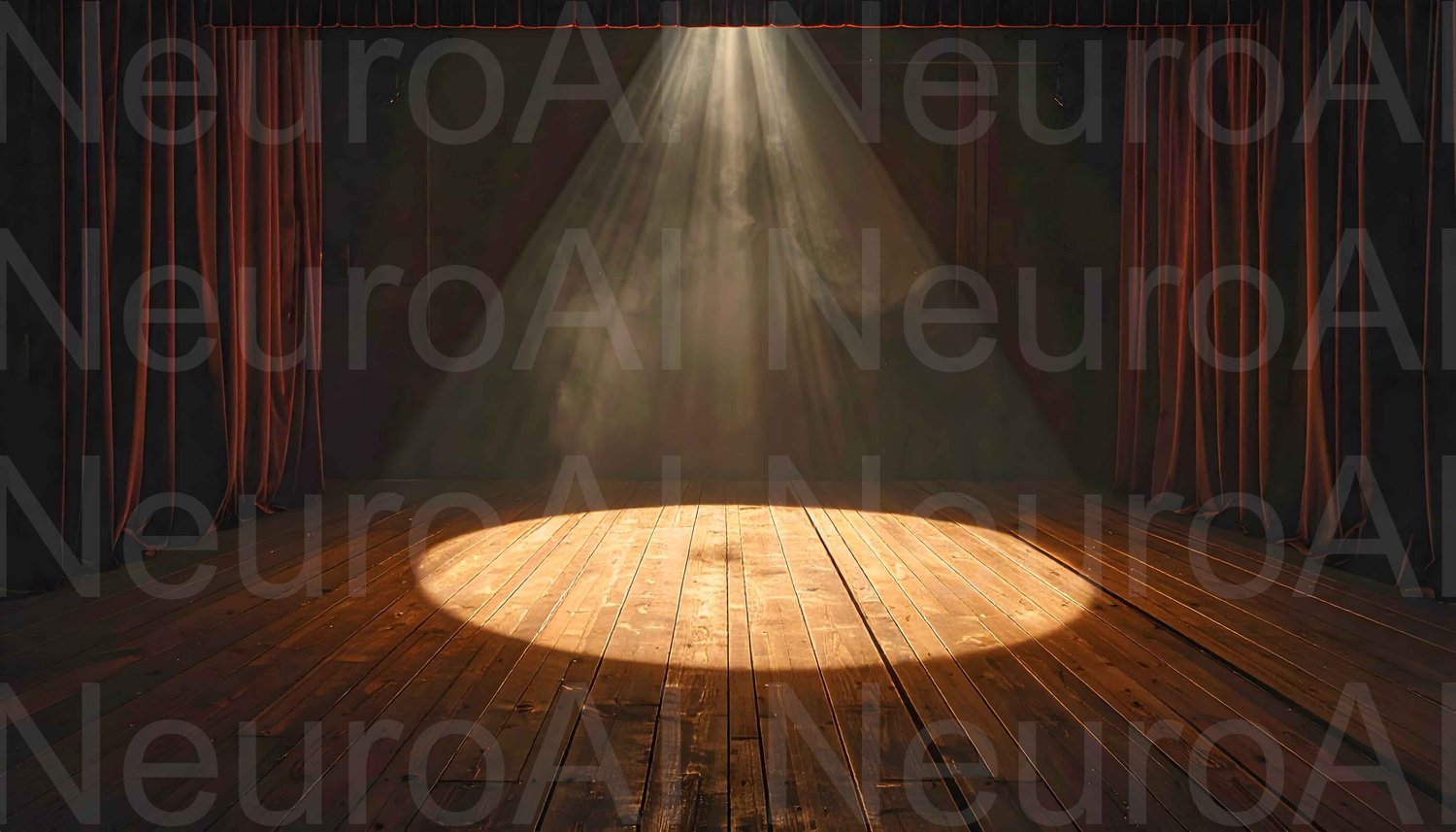 The anticipation and drama of an empty theater stage. The deep red velvet curtains are drawn open, and a single spotlight falls onto the wooden floor, creating a powerful and mysterious focus. This visual is perfect for depicting beginnings, opportunities, or moments waiting to be filled.