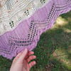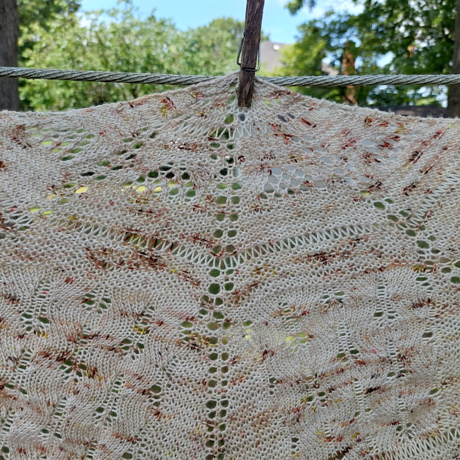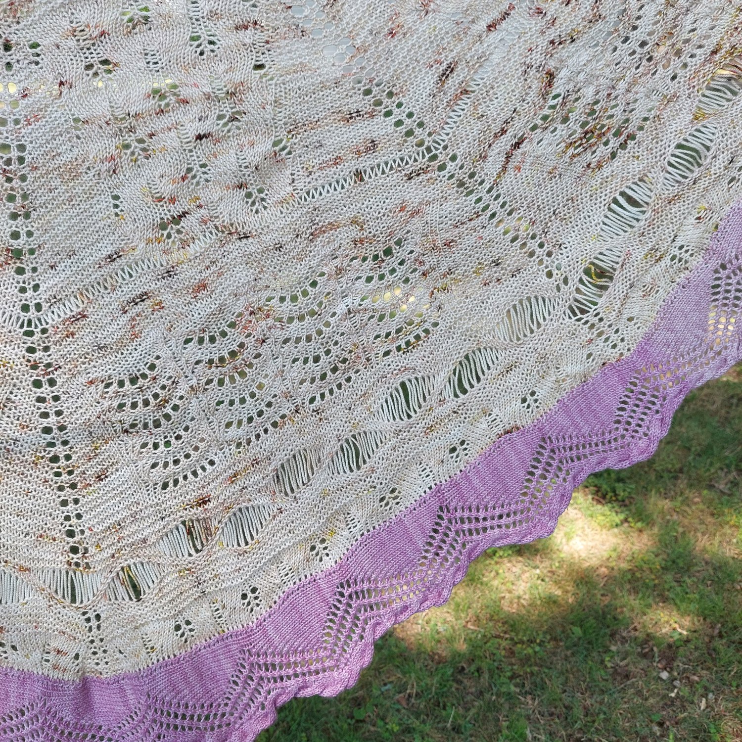 I recommend choosing yarn with drape and flexibility. A silkier yarn would make a nice light, summer shawl while a wool yarn will create a warmer one. I like how superwash wool grows to create a big shawl which is one of the reasons I chose this yarn. Yarns that do not grow as much (acrylic, non-superwash wool, etc) will likely result in a smaller shawl.