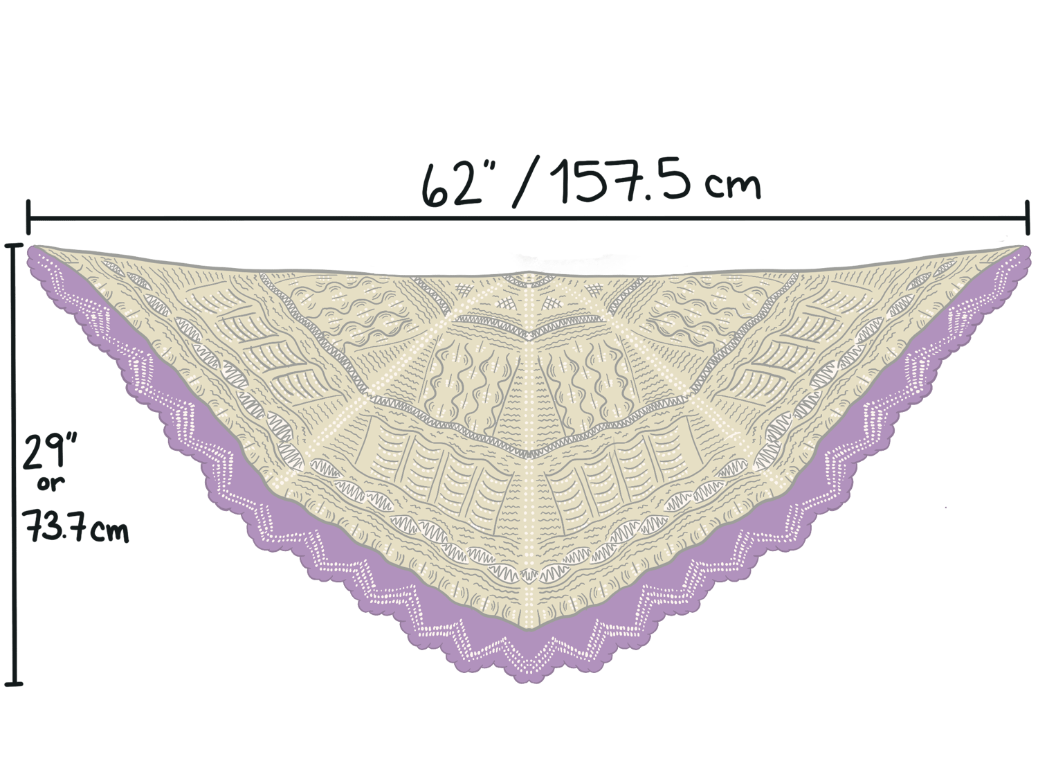 This pattern is written in one size with the finished measurements of 62” / 157.5 cm wide x 29” / 73.7 cm tall