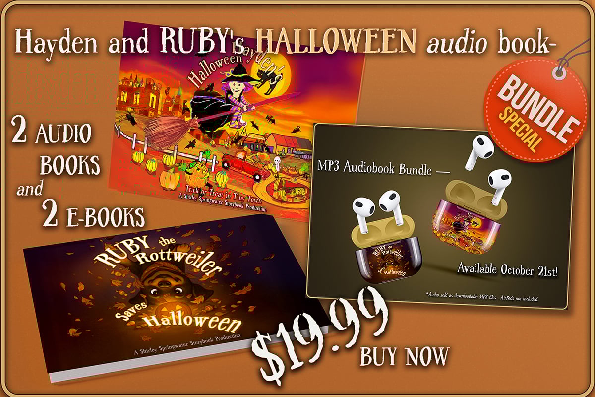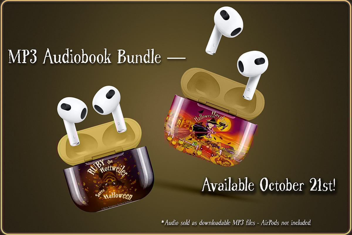 Includes both e-books — “Ruby the Rottweiler Saves Halloween” and “Hayden’s Halloween: Trick or Treat in Tiny Town” — plus exclusive narrated editions (coming October 21, 2025).