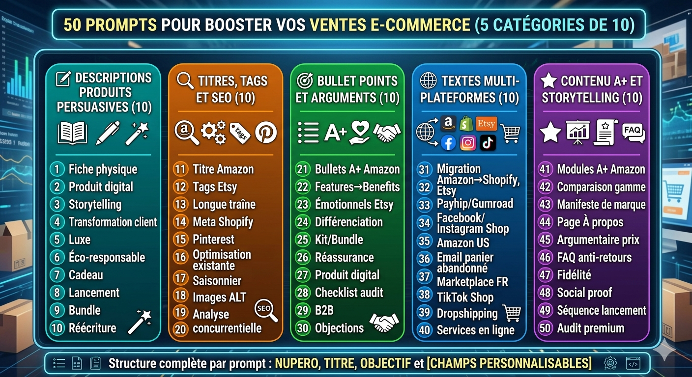 - 🌐 Textes multi-plateformes (10 prompts) — migration Amazon→Shopify, Etsy, Payhip/Gumroad, Facebook/Instagram Shop, Amazon US, email panier abandonné, marketplace FR, TikTok Shop, dropshipping, services en ligne