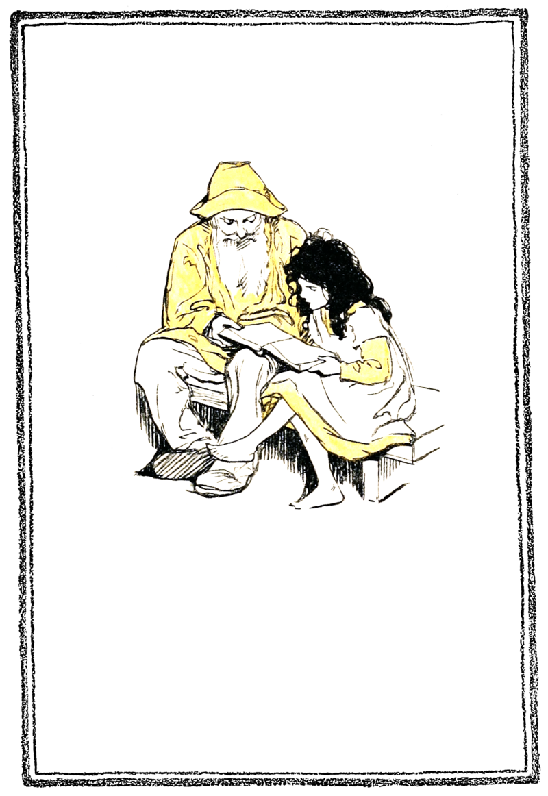 This heartwarming vintage illustration portrays Heidi sitting beside her grandfather, both immersed in the pages of a book.