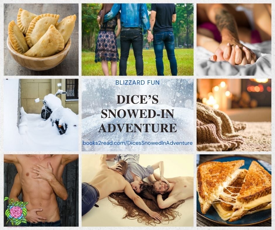 Dice’s Snowed-In Adventure is a happy instalove menage holiday novella- little longer than a short story, little shorter than a full length novel. Full of love, laughter and snow! Cinnamon roll hispanic food loving hero!